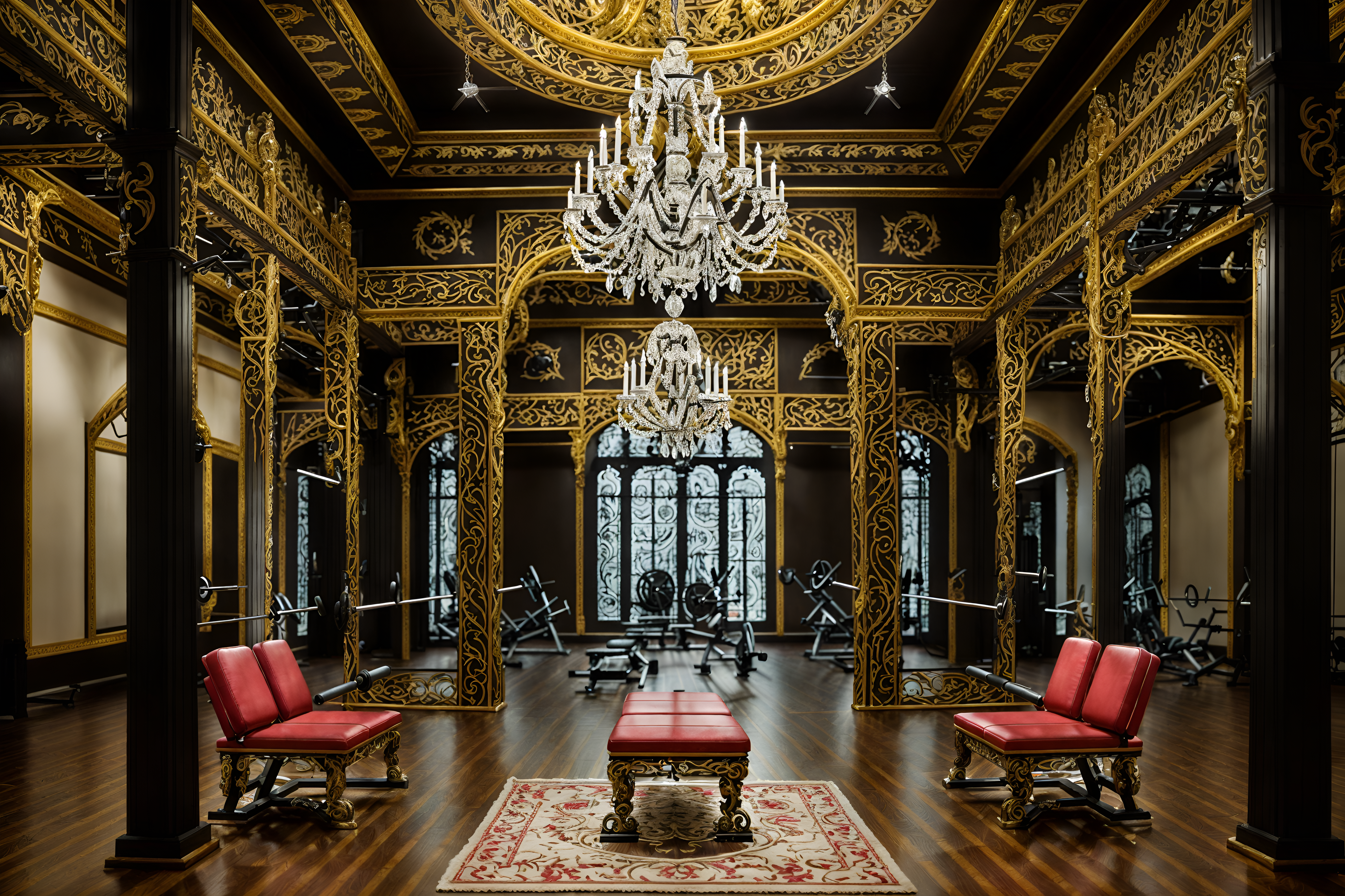 photo from pinterest of baroque-style interior designed (fitness gym interior) with crosstrainer and bench press and exercise bicycle and dumbbell stand and squat rack and crosstrainer. . with tension and movement and emotional exuberance and crystal and glass accents and drama and twisted columns and intricate carvings and ornaments and dynamism. . cinematic photo, highly detailed, cinematic lighting, ultra-detailed, ultrarealistic, photorealism, 8k. trending on pinterest. baroque interior design style. masterpiece, cinematic light, ultrarealistic+, photorealistic+, 8k, raw photo, realistic, sharp focus on eyes, (symmetrical eyes), (intact eyes), hyperrealistic, highest quality, best quality, , highly detailed, masterpiece, best quality, extremely detailed 8k wallpaper, masterpiece, best quality, ultra-detailed, best shadow, detailed background, detailed face, detailed eyes, high contrast, best illumination, detailed face, dulux, caustic, dynamic angle, detailed glow. dramatic lighting. highly detailed, insanely detailed hair, symmetrical, intricate details, professionally retouched, 8k high definition. strong bokeh. award winning photo.