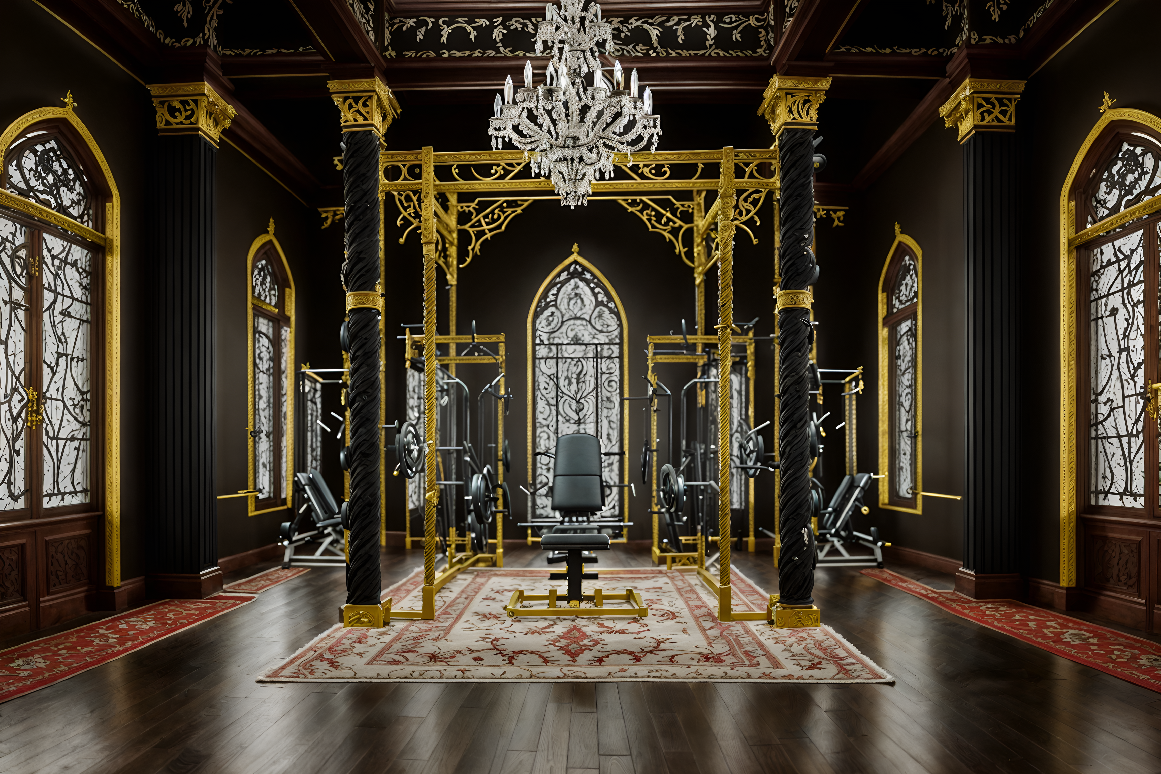 photo from pinterest of baroque-style interior designed (fitness gym interior) with crosstrainer and bench press and exercise bicycle and dumbbell stand and squat rack and crosstrainer. . with tension and movement and emotional exuberance and crystal and glass accents and drama and twisted columns and intricate carvings and ornaments and dynamism. . cinematic photo, highly detailed, cinematic lighting, ultra-detailed, ultrarealistic, photorealism, 8k. trending on pinterest. baroque interior design style. masterpiece, cinematic light, ultrarealistic+, photorealistic+, 8k, raw photo, realistic, sharp focus on eyes, (symmetrical eyes), (intact eyes), hyperrealistic, highest quality, best quality, , highly detailed, masterpiece, best quality, extremely detailed 8k wallpaper, masterpiece, best quality, ultra-detailed, best shadow, detailed background, detailed face, detailed eyes, high contrast, best illumination, detailed face, dulux, caustic, dynamic angle, detailed glow. dramatic lighting. highly detailed, insanely detailed hair, symmetrical, intricate details, professionally retouched, 8k high definition. strong bokeh. award winning photo.