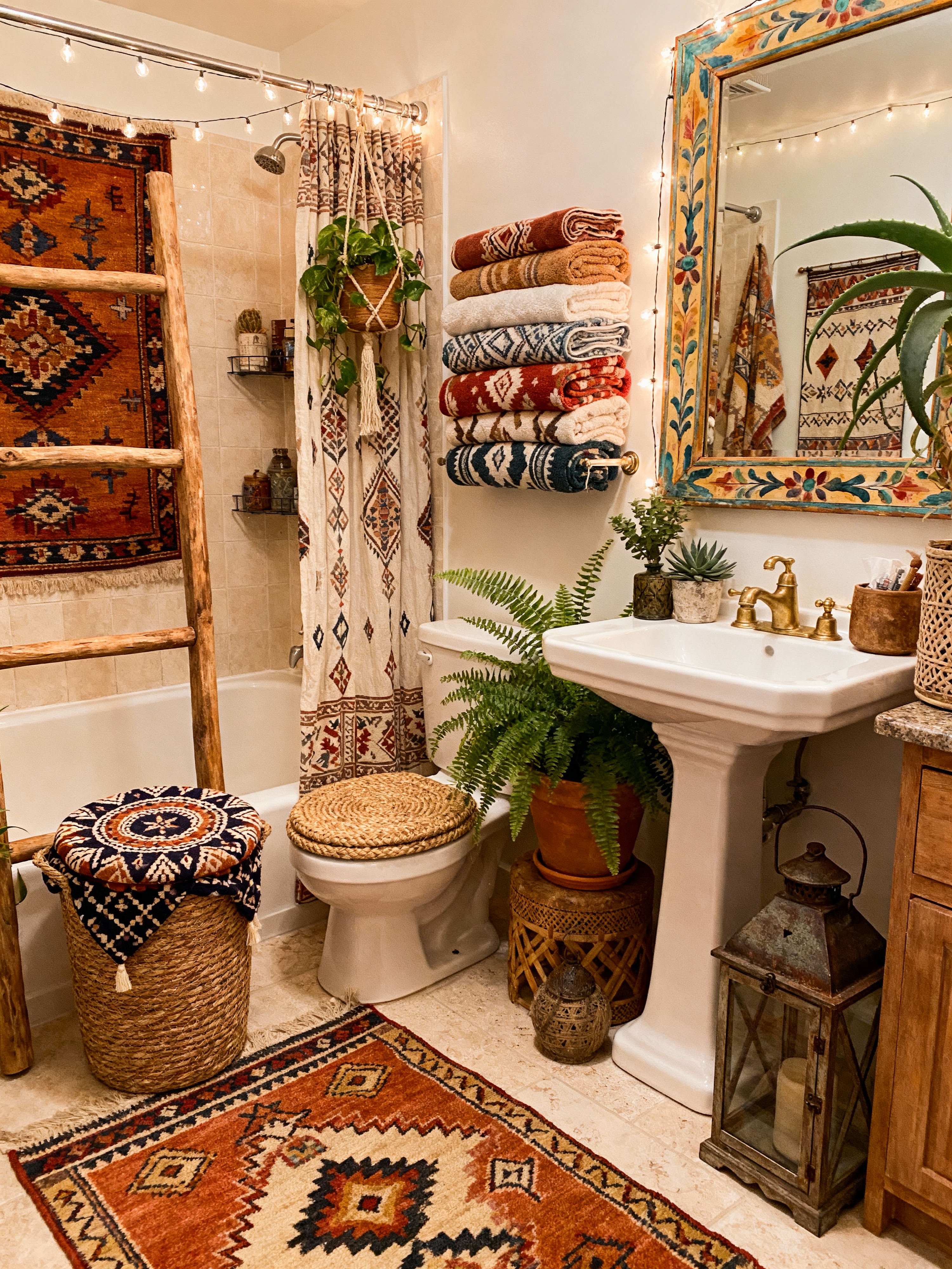 bathroom with boho-chic style with waste basket and toilet seat and bath rail and shower and bathroom sink with faucet and bath towel and mirror and plant. . with global artifacts and bohemian flair and relaxed atmosphere and vintage finds and layered textiles and eclectic mix and artistic touches and mixed patterns