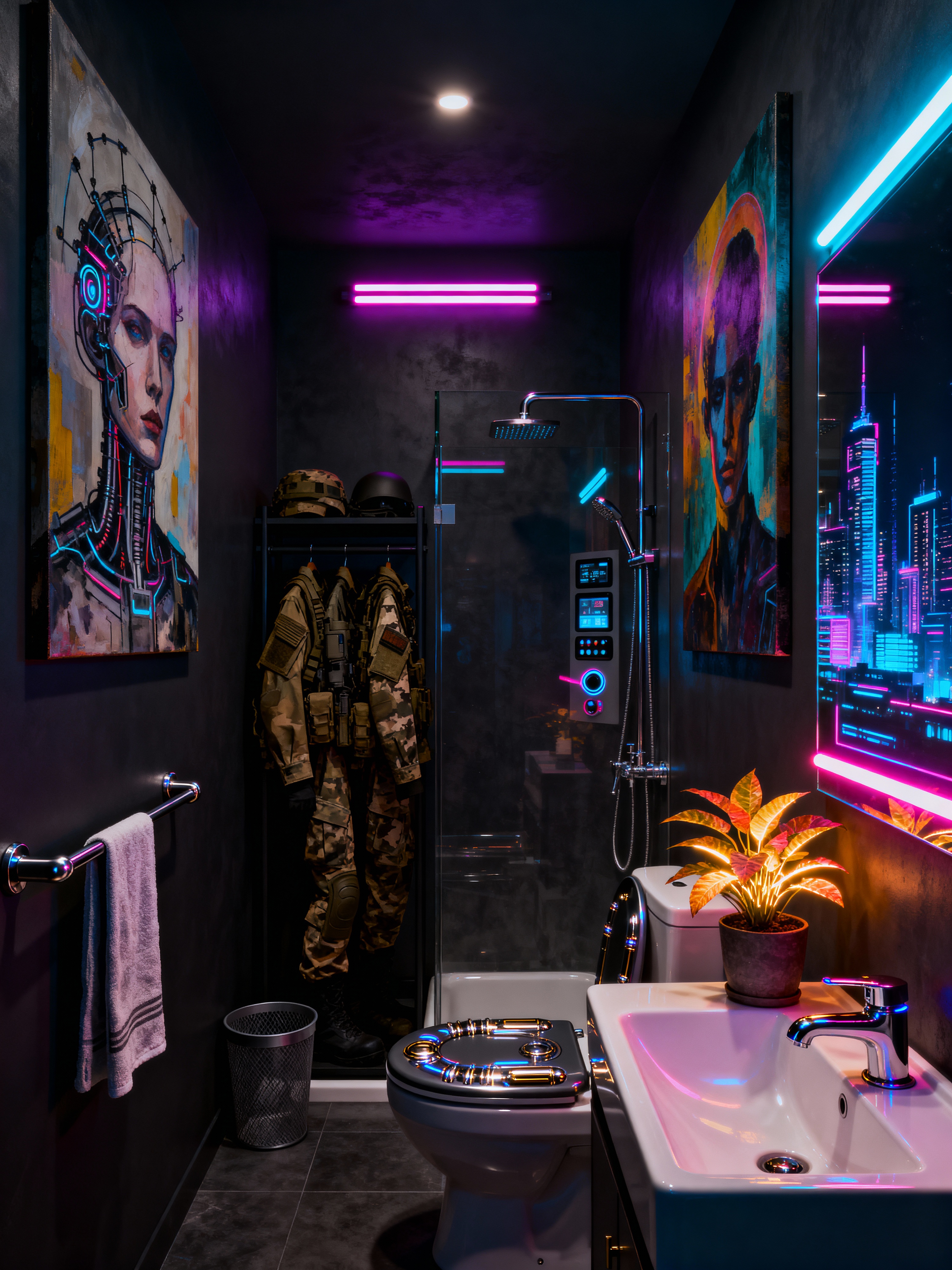 bathroom with cyberpunk style with bath rail and bath towel and waste basket and mirror and shower and toilet seat and bathroom sink with faucet and plant. . with military uniforms and gear and surrealist paintings and futuristic cybernetic details and futuristic cybernetic city and minimalist and cyberpunk lights and color lights glow and dark night