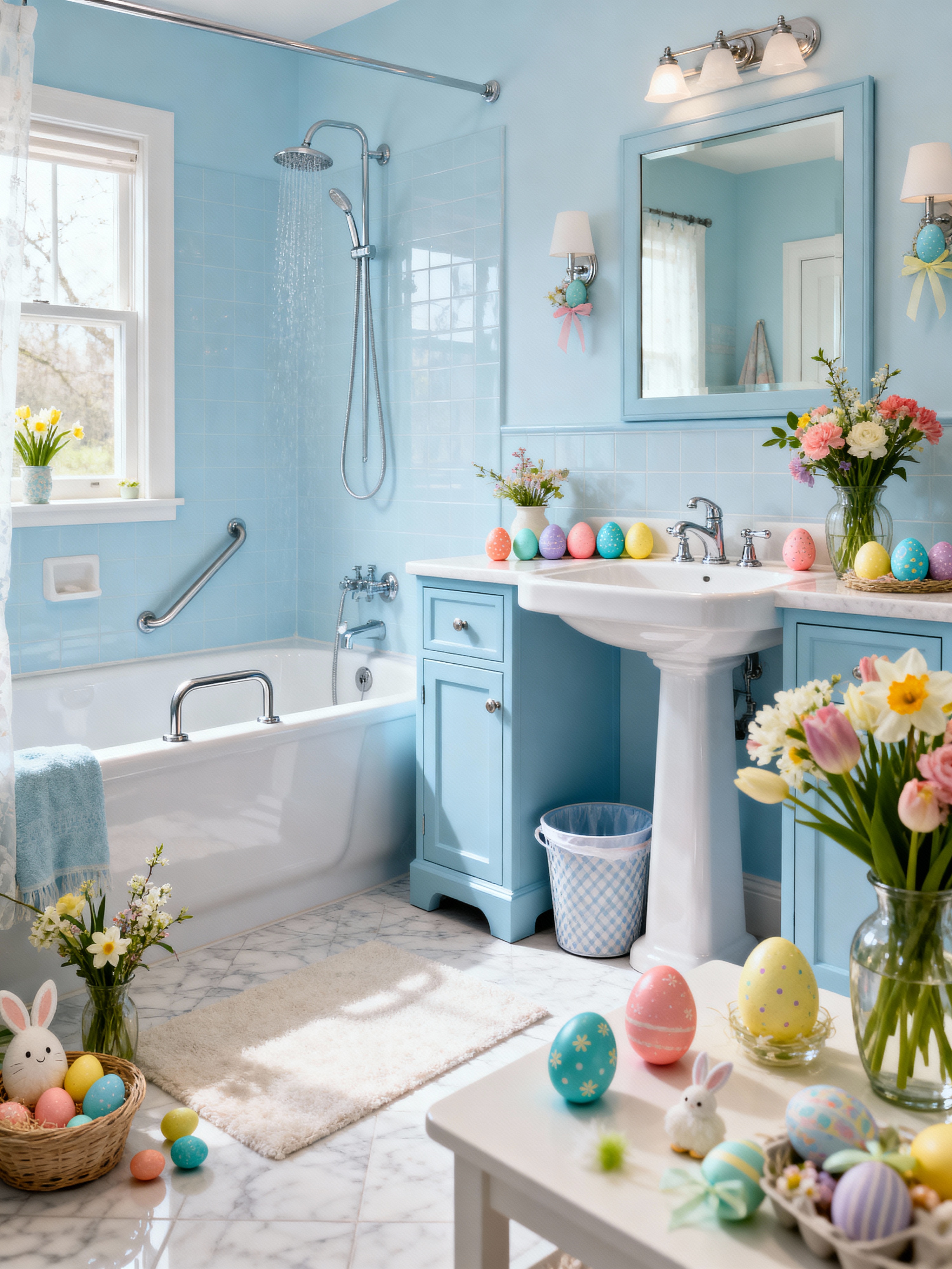 bathroom with easter style with bath rail and bathtub and plant and bathroom cabinet and shower and waste basket and bathroom sink with faucet and mirror. . with spring decorations and colorful easter eggs and light blue colors and flowers on table and easter decorations and spring decorations