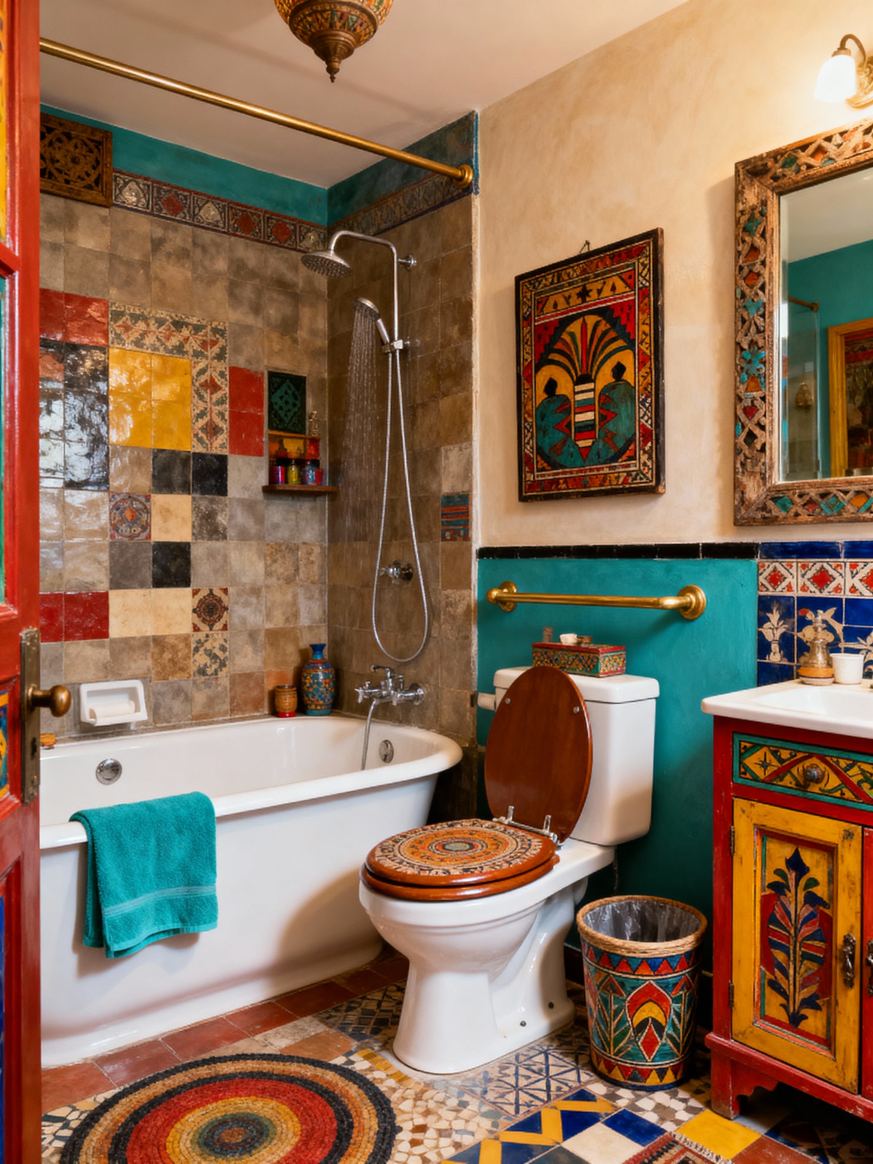 bathroom with eclectic style with bathtub and toilet seat and bath towel and bathroom cabinet and waste basket and mirror and bath rail and shower. . with creative freedom and layered textures and vintage finds and colorful palette and artistic flair and unique pieces and unexpected elements and global influences