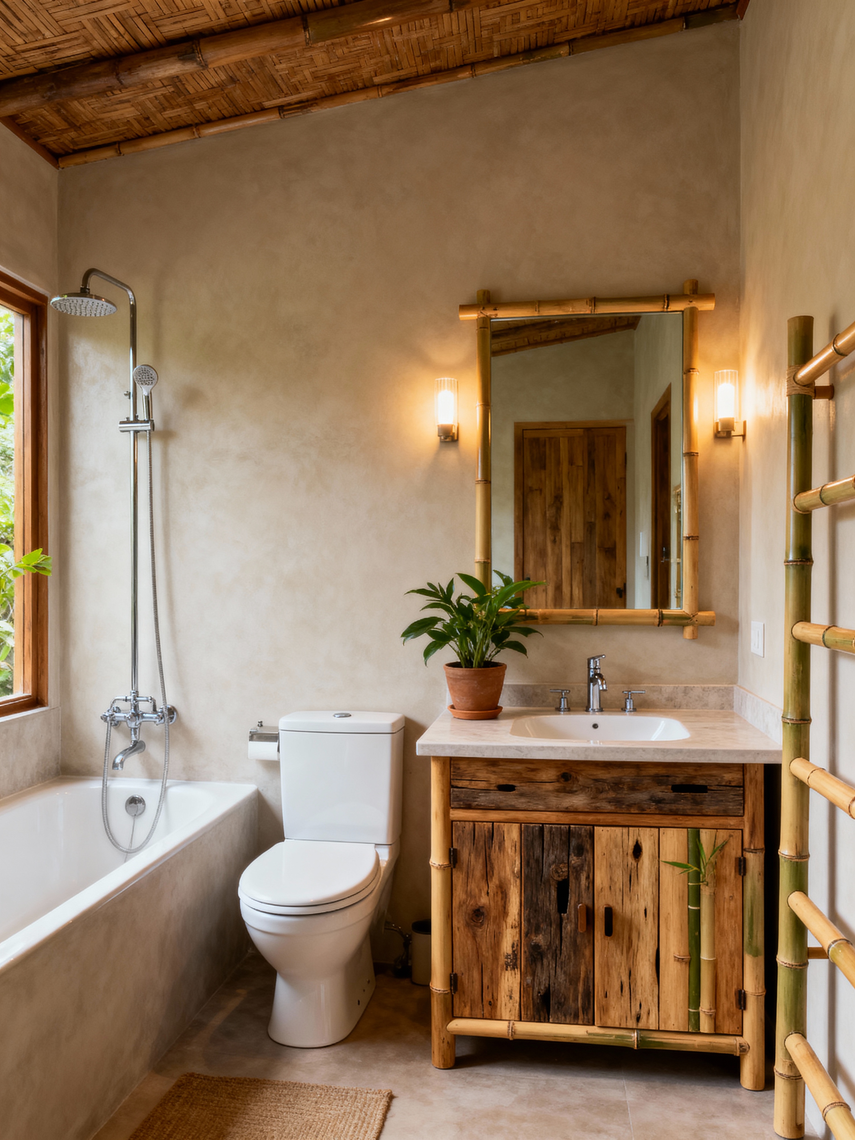 bathroom with eco-friendly style with mirror and toilet seat and bathtub and shower and bathroom sink with faucet and bathroom cabinet and plant and bath rail. . with energy efficient and natural fibers and bamboo furniture and renewable resources and sustainable materials and environmentally conscious and non-toxic finishes and reclaimed wood