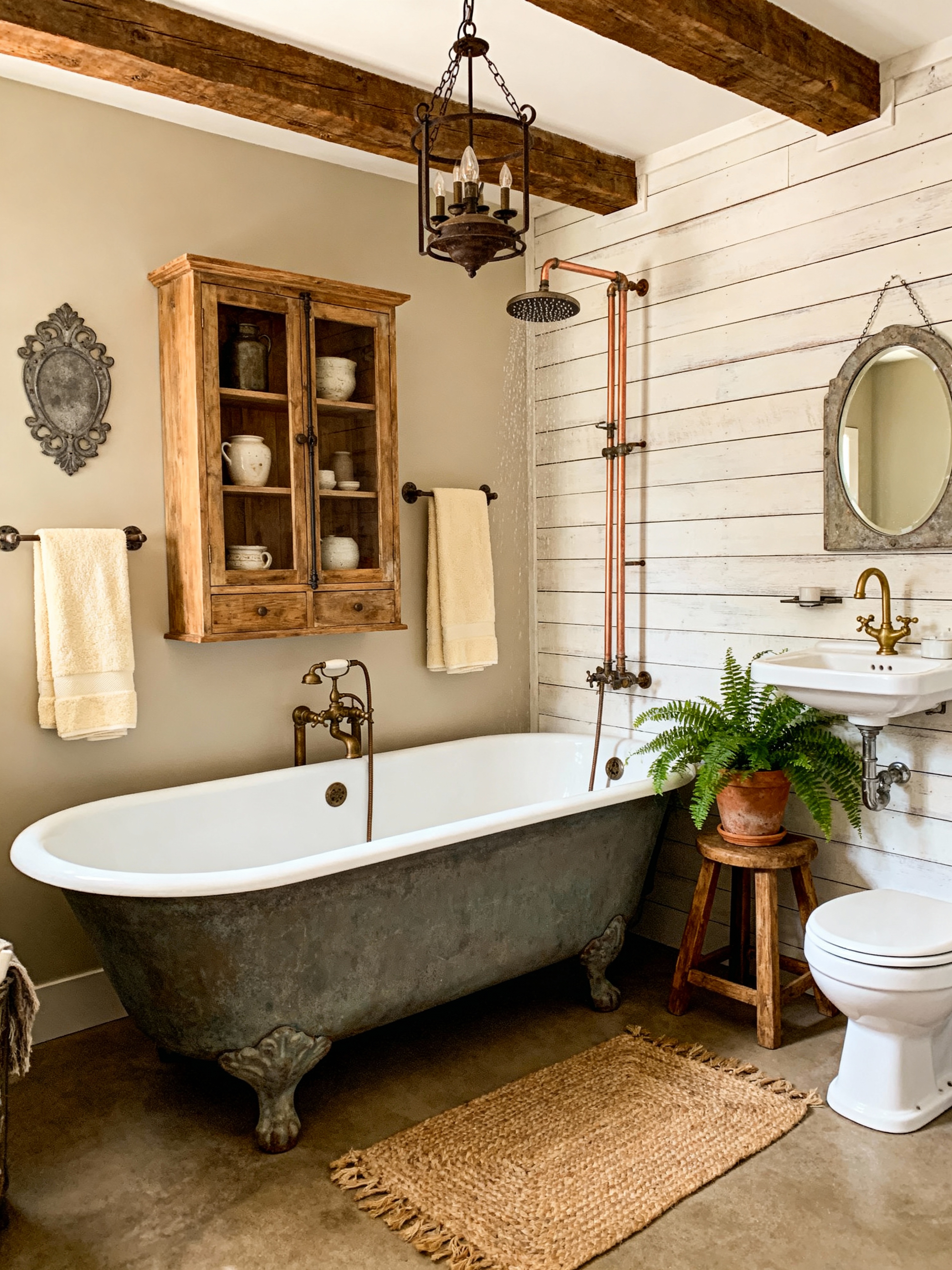 bathroom with farmhouse style with bath towel and bathroom cabinet and bath rail and shower and plant and bathtub and toilet seat and bathroom sink with faucet. . with rustic charm and industrial accents and exposed wood and shiplap walls and vintage decor and open shelving and cozy feel and country style