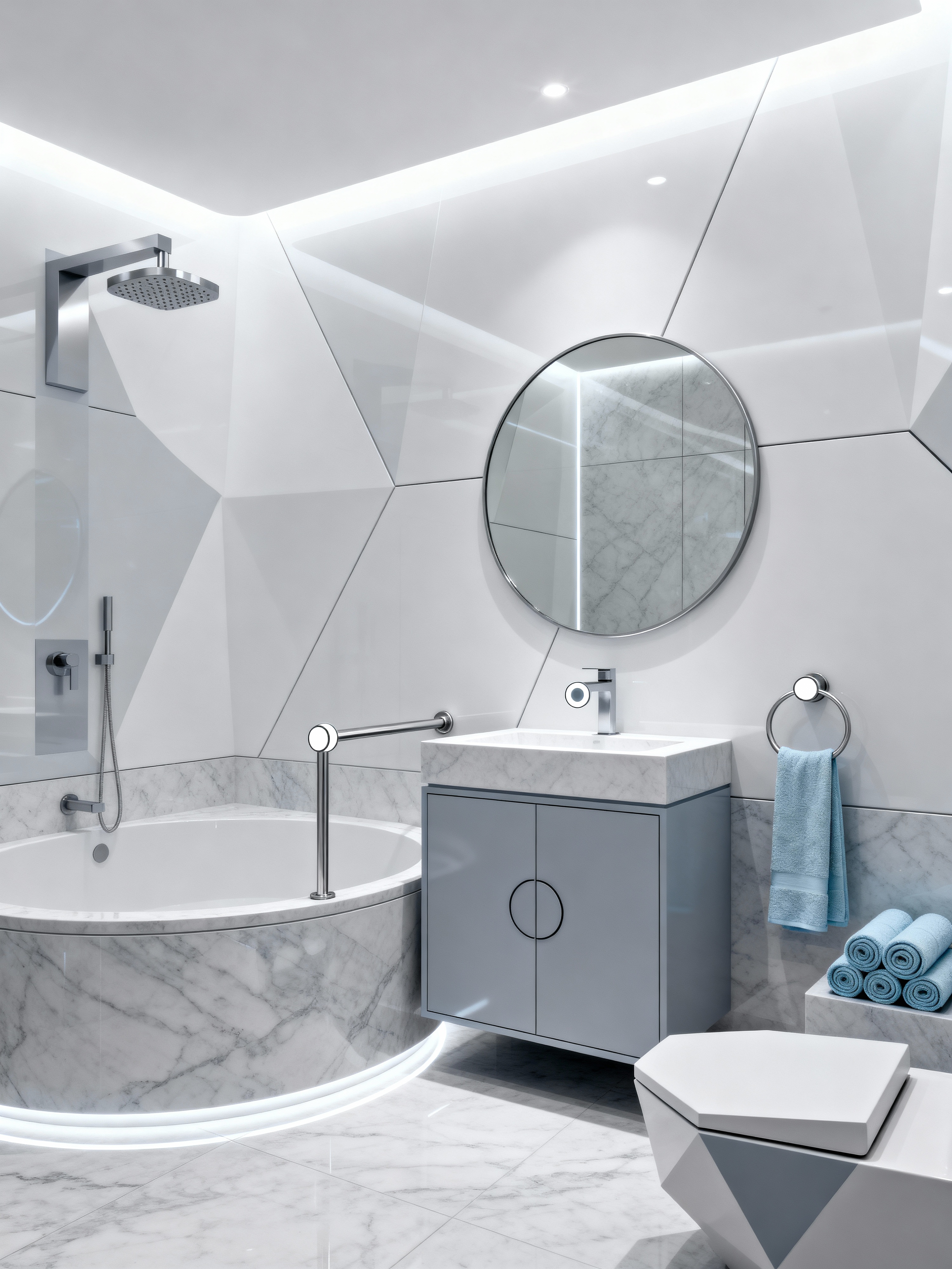 bathroom with futuristic style with bath towel and bath rail and bathtub and mirror and toilet seat and bathroom cabinet and shower and bathroom sink with faucet. . with futuristic interior and circular shapes and monochromatic palette and futurism minimalist interior and futurism and strong geometric walls and light colors and smooth marble