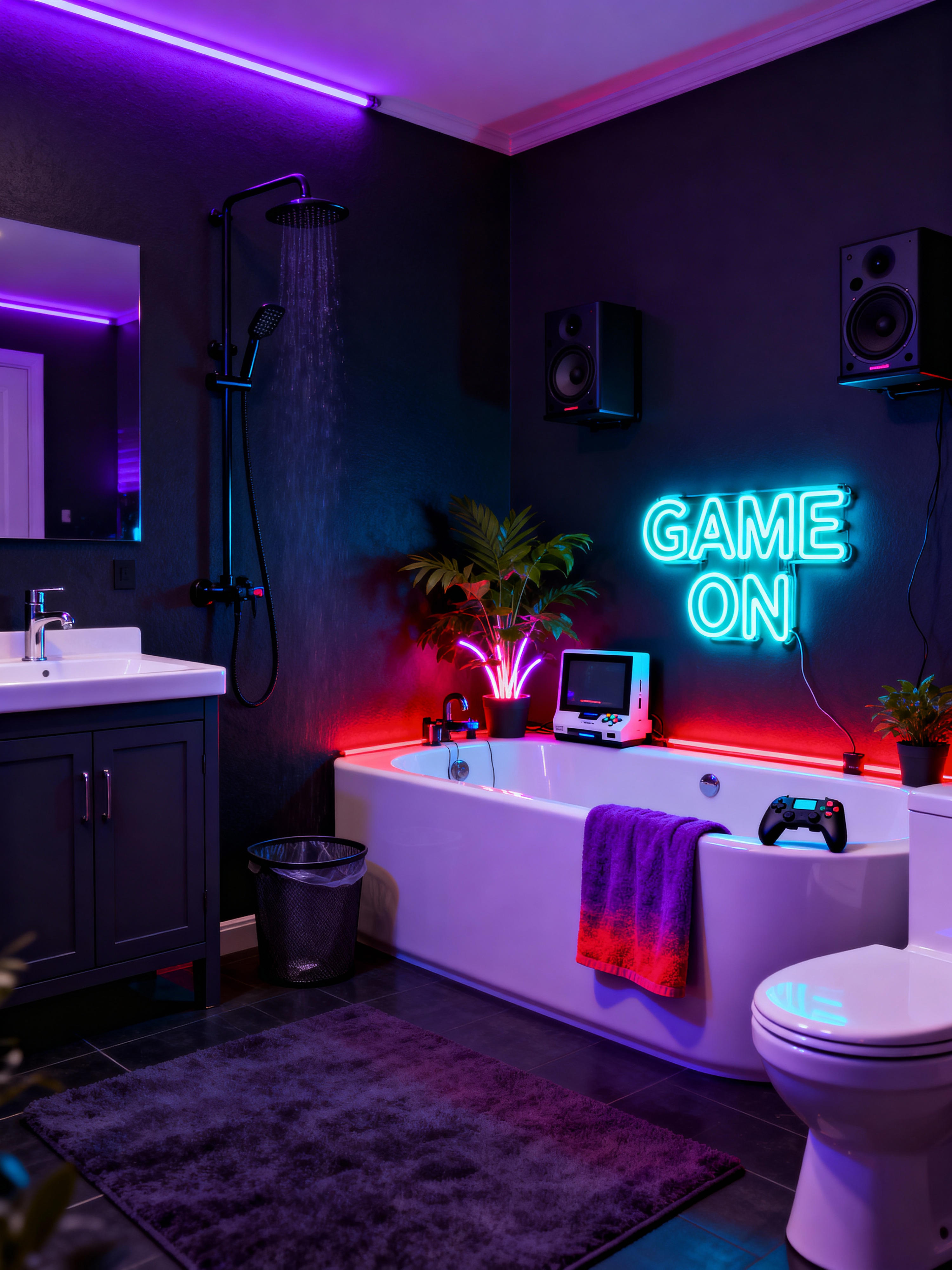 bathroom with gaming room style with bathroom cabinet and shower and waste basket and bathroom sink with faucet and bathtub and bath towel and toilet seat and plant. . with neon letters on wall and dark lit room and purple and red lights and video game consoles and dark walls and at night and speakers and purple, red and blue fade light