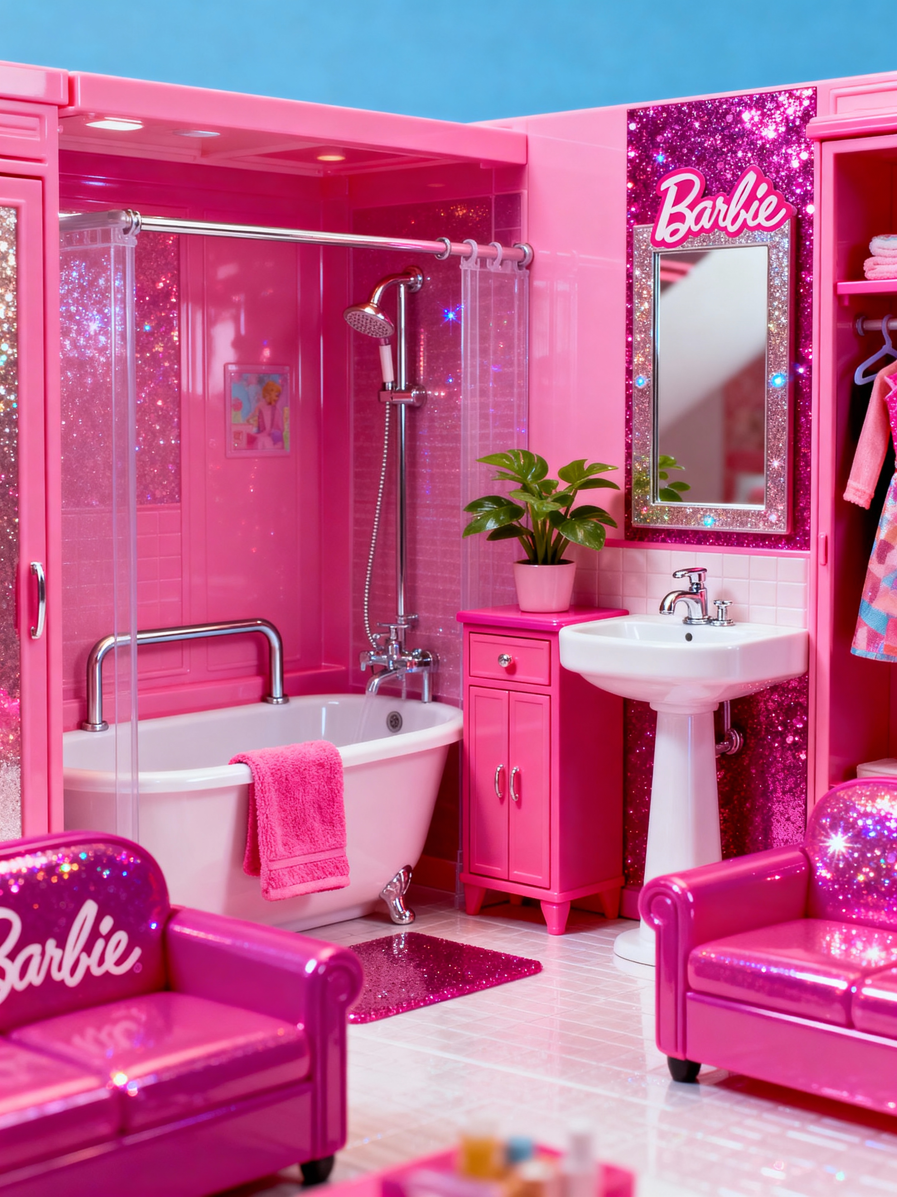 bathroom with hot pink style with bathtub and bath towel and bathroom cabinet and mirror and plant and shower and bath rail and bathroom sink with faucet. . with barbie plastic interior and barbie style interior and barbie sofa and hot pink barbie colors and barbie closet and barbie bold rosy hues like fuchsia and magenta and barbie glitter and sparkle and hot pink barbie walls