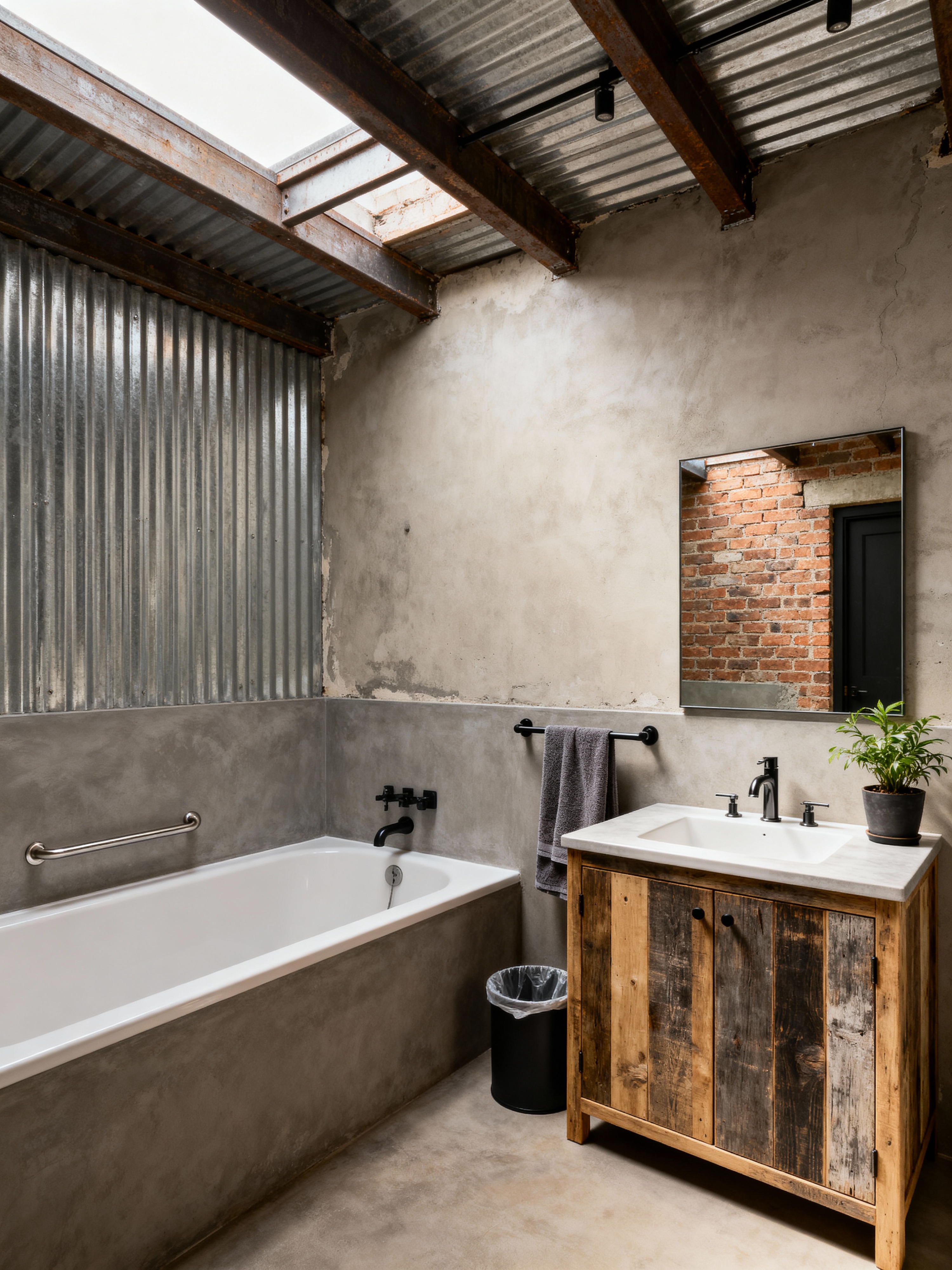 bathroom with industrial style with mirror and bath towel and bathtub and bathroom cabinet and bathroom sink with faucet and waste basket and bath rail and plant. . with exposed rafters and reclaimed wood and exposed concrete and exposed brick and neutral tones and metal panels and raw aesthetic and open floorplan