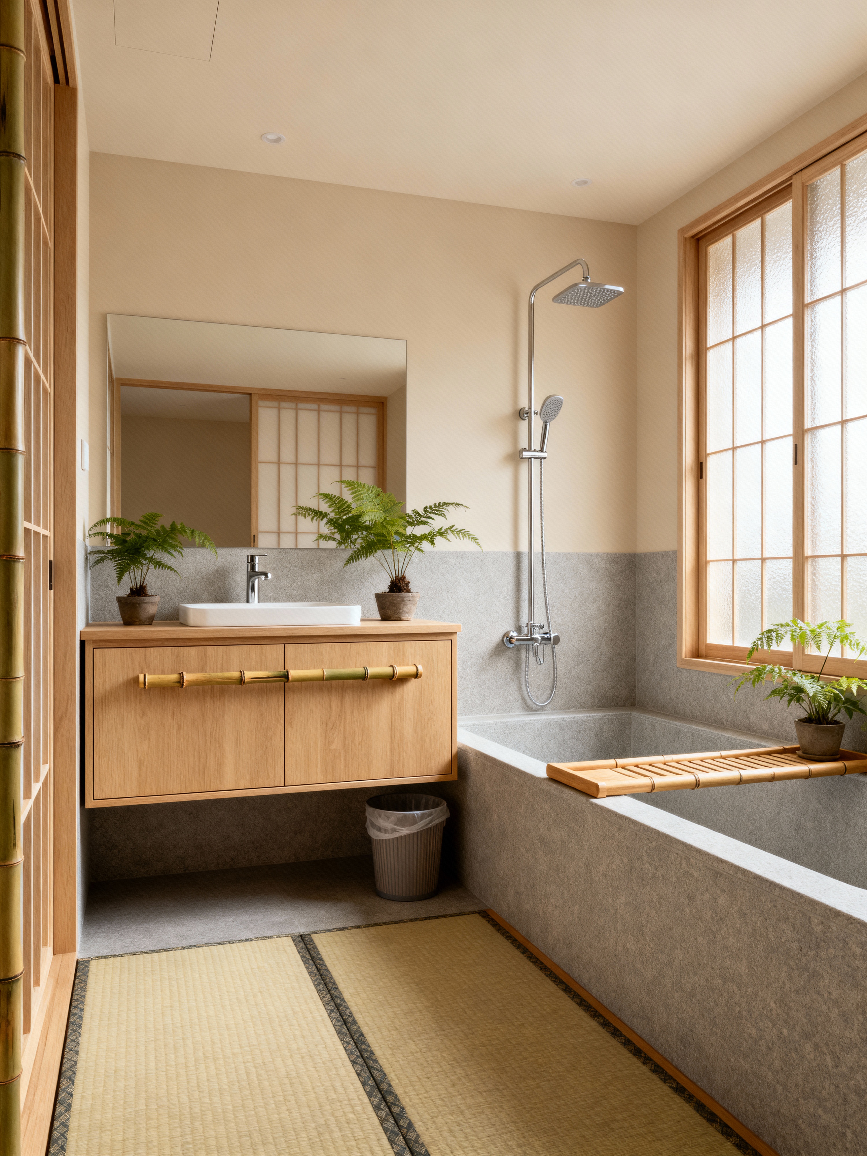bathroom with japanese design style with bathroom cabinet and plant and bath towel and bathroom sink with faucet and bath rail and bathtub and waste basket and shower. . with bamboo accents and neutral colors and tranquility and indoor plants and tatami mats and natural materials and minimalism and sliding doors