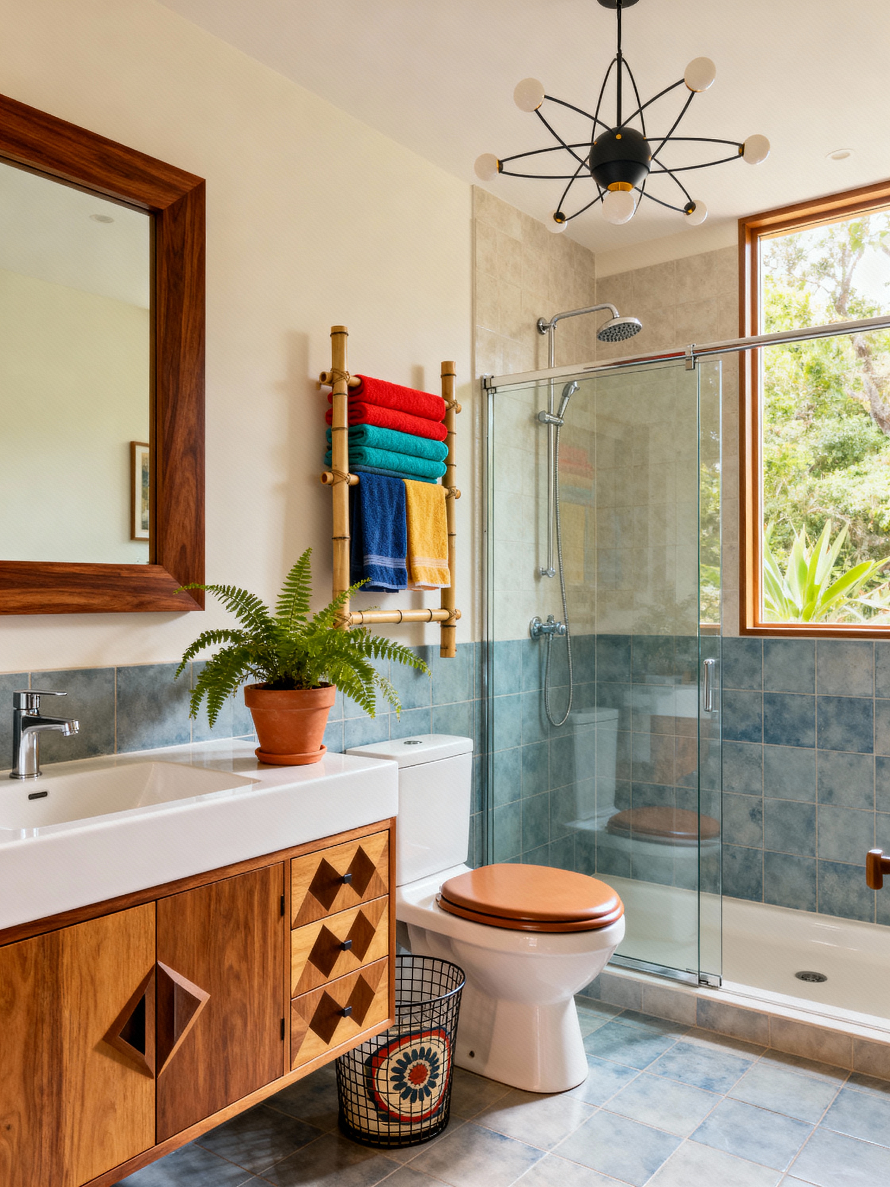 bathroom with midcentury modern style with bathroom sink with faucet and bathroom cabinet and shower and toilet seat and plant and waste basket and bath towel and mirror. . with minimalist and graphic shapes and nature indoors and vibrant colors and integrating indoor and outdoor motifs and mid century modern mobile chandelier and muted tones and clean lines