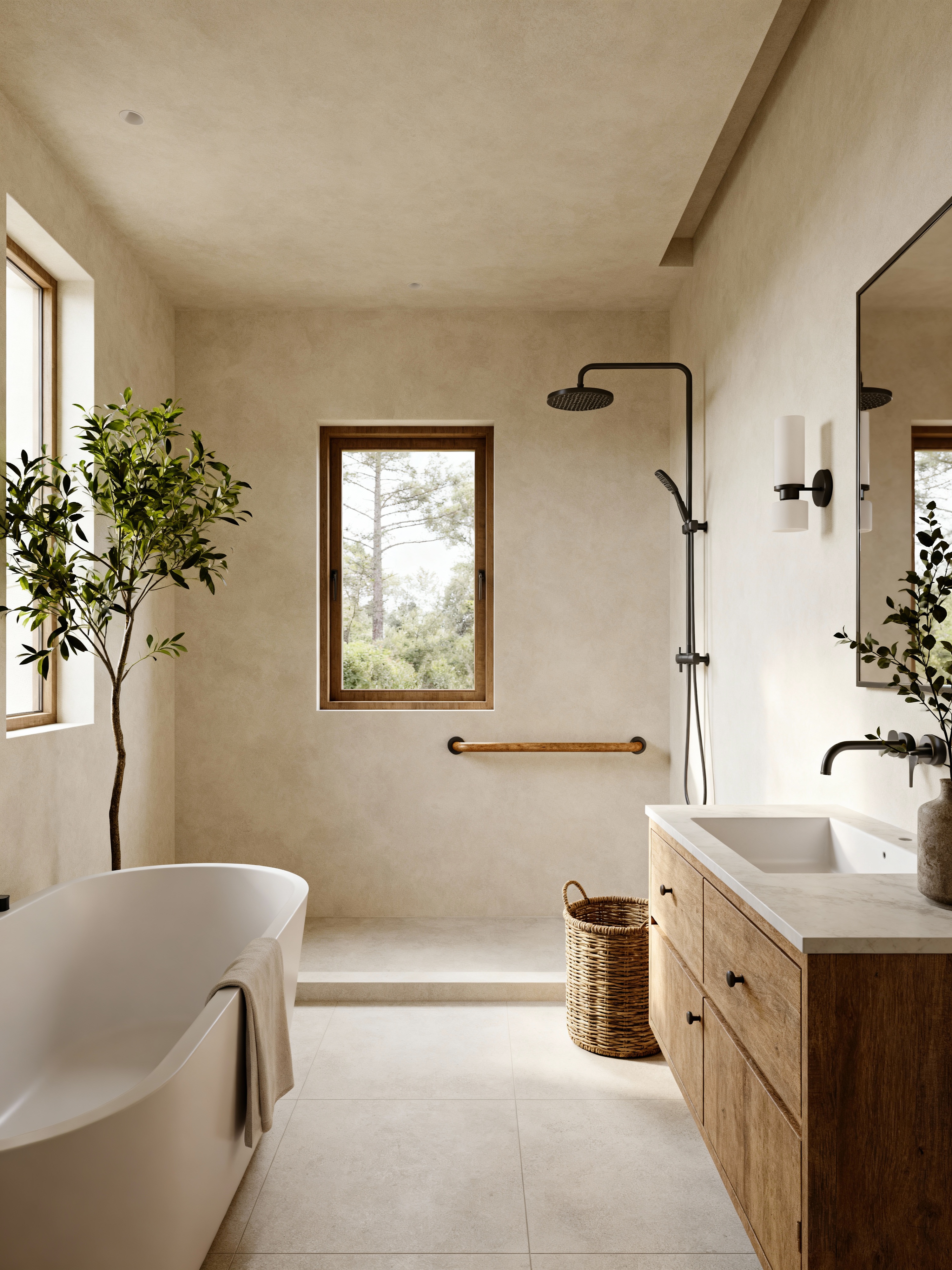 bathroom with modern style with bathtub and bathroom cabinet and bathroom sink with faucet and shower and waste basket and mirror and bath rail and plant. . with neutral walls and textures and practicality and functionality and open and natural lighting and simple, clean lines and simplistic furniture and natural materials and elements and neutral walls and textures
