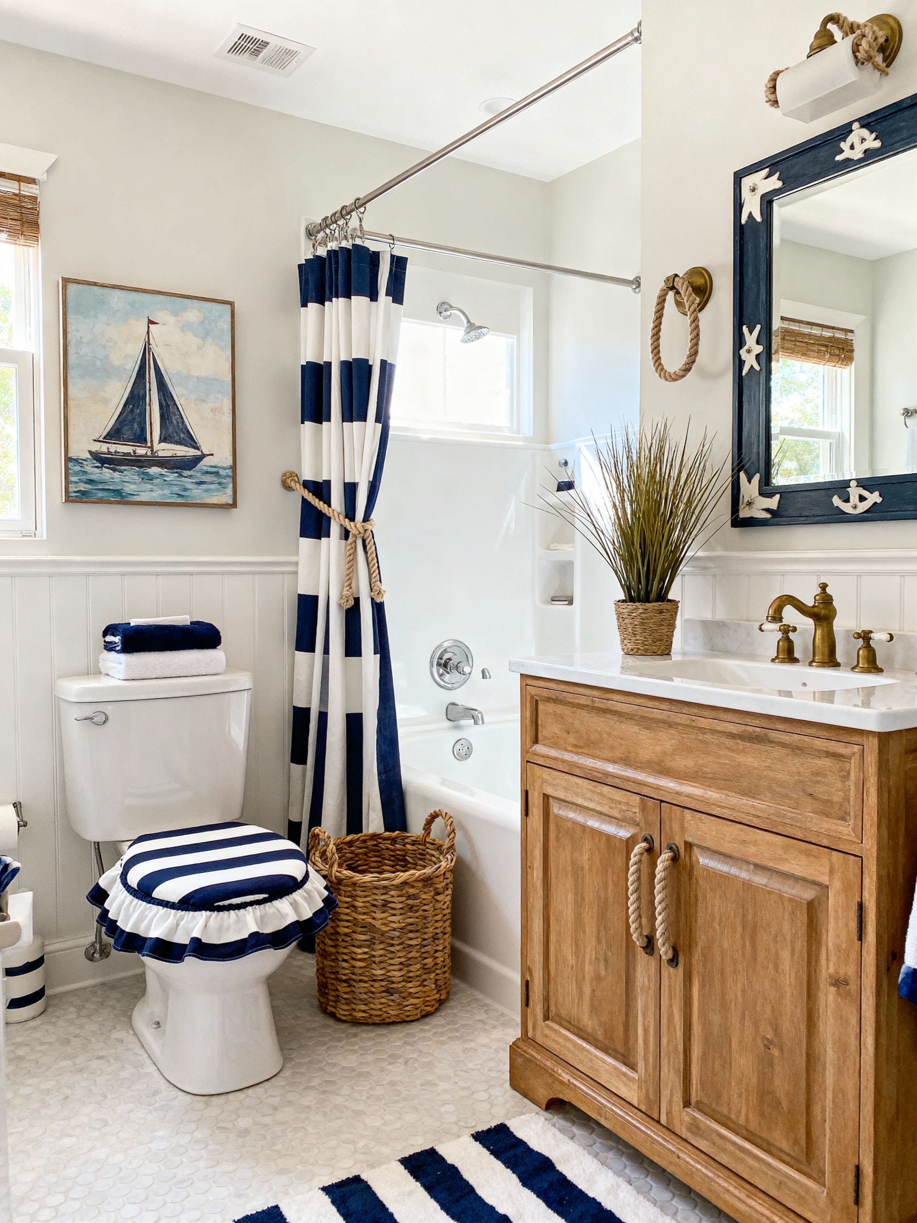 bathroom with nautical style with toilet seat and bathroom sink with faucet and waste basket and plant and shower and bathtub and bathroom cabinet and mirror. . with navy blue and maritime decor and coastal vibes and sailboat elements and rope details and ocean inspiration and seaside charm and striped patterns