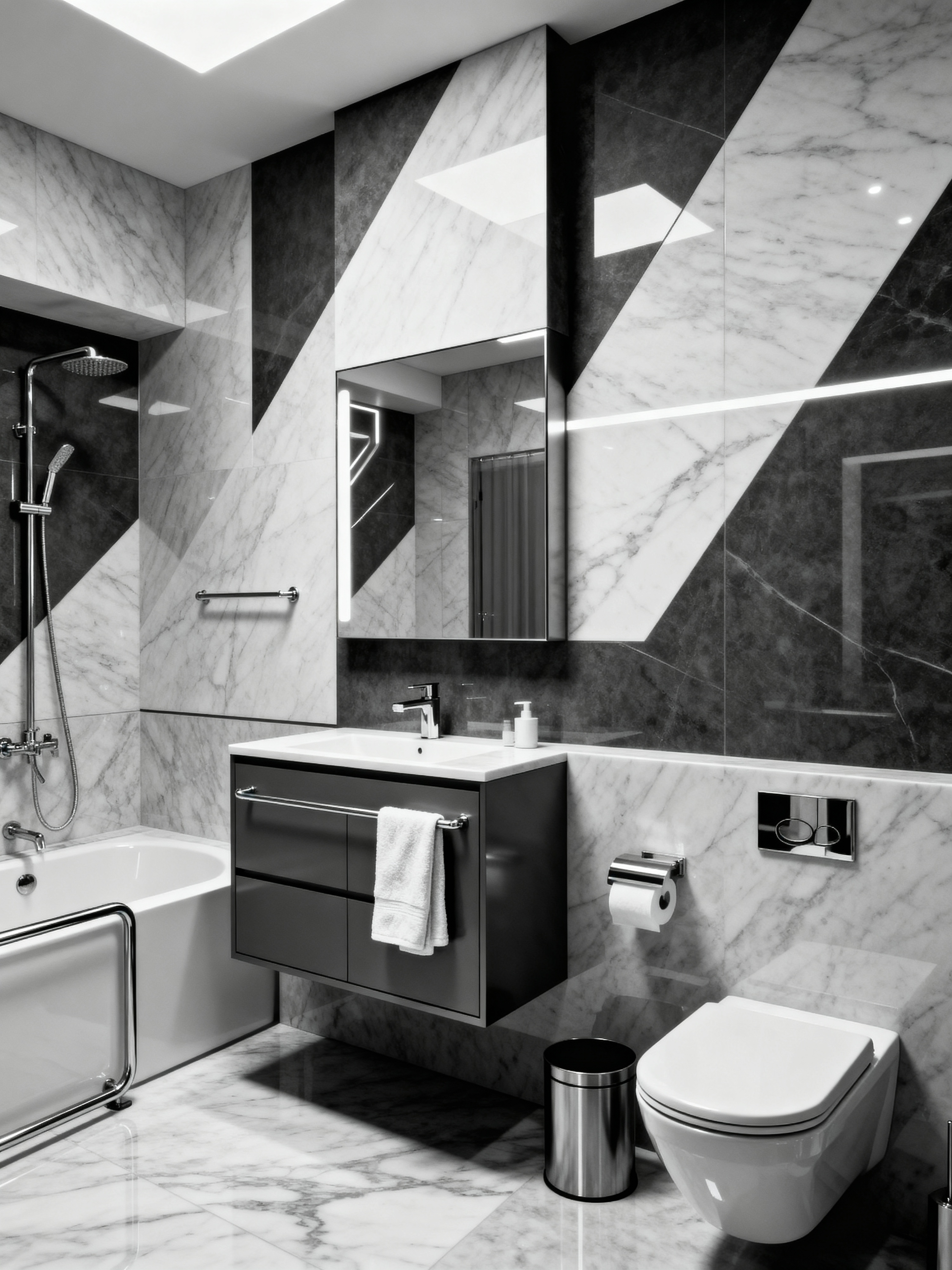 bathroom with retro futuristic style with bathroom cabinet and mirror and bathtub and bath rail and shower and bath towel and waste basket and toilet seat. . with strong geometric walls and floating surfaces and futuristic interior and minimalist clean lines and monochromatic palette and smooth polished marble and smooth marble and steel finishing