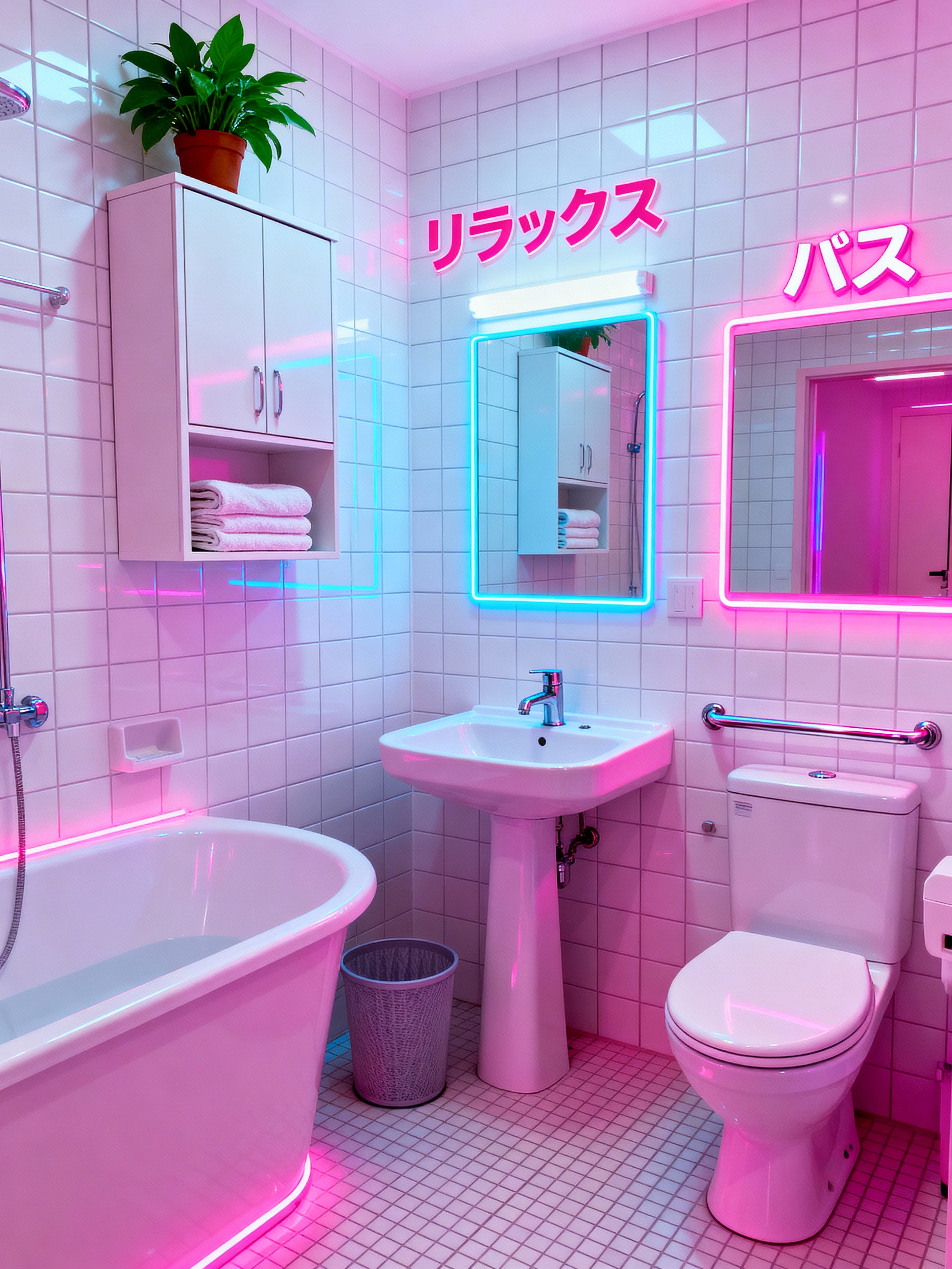 bathroom with vaporwave style with bathroom cabinet and plant and bath towel and bathroom sink with faucet and waste basket and mirror and bath rail and toilet seat. . with white square bath tiles and japanese letters on wall and japanese letters on wall and neon glow and bright pink and japanese letters on wall and neon glow and white square bath tiles