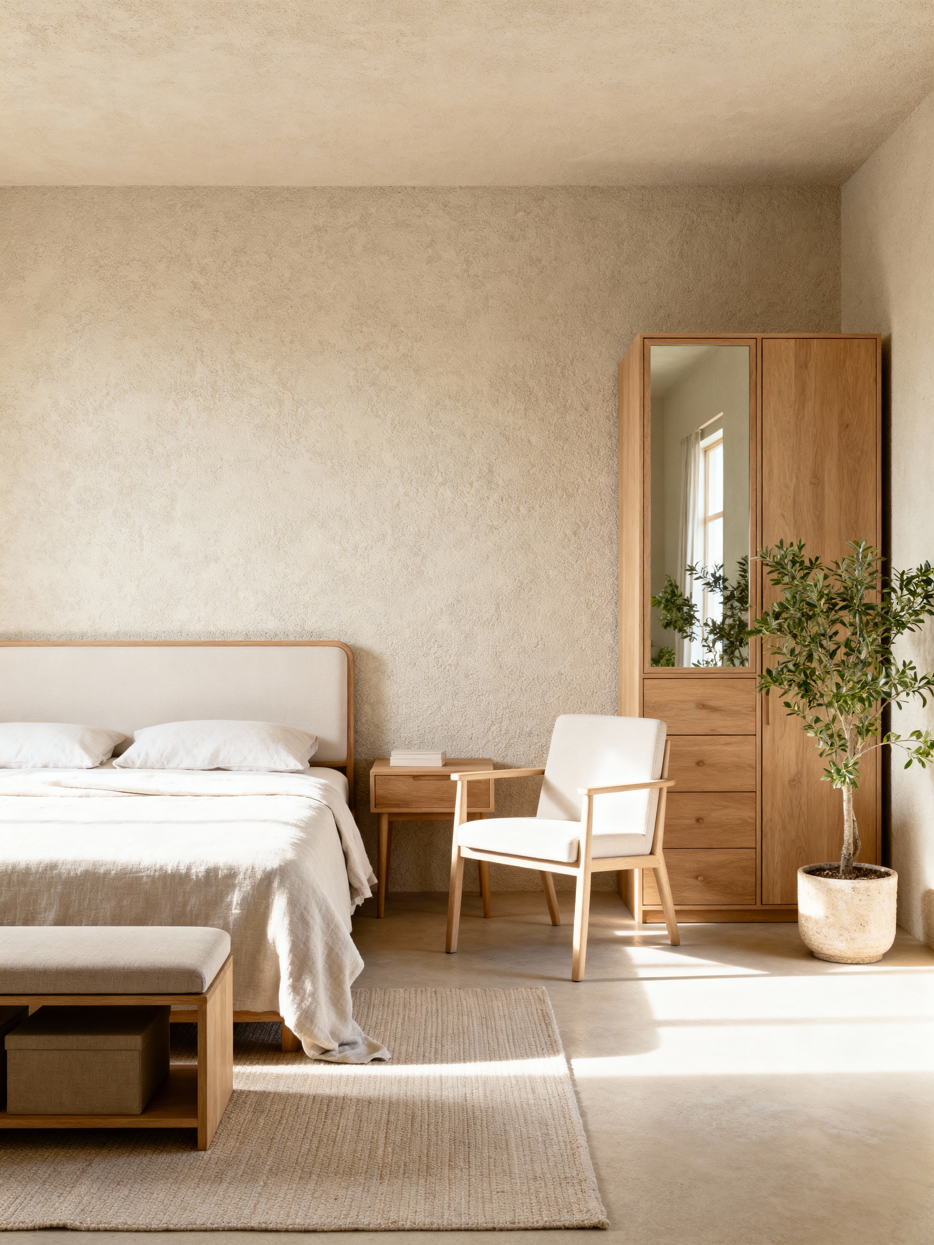 bedroom with airbnb style with accent chair and bedside table or night stand and plant and dresser closet and mirror and headboard and bed and storage bench or ottoman. . with neutral walls and textures and natural materials and elements and open and natural lighting and practicality and functionality and scandinavian style and simple, clean lines and simplistic furniture and simple color palette and neutral walls and textures