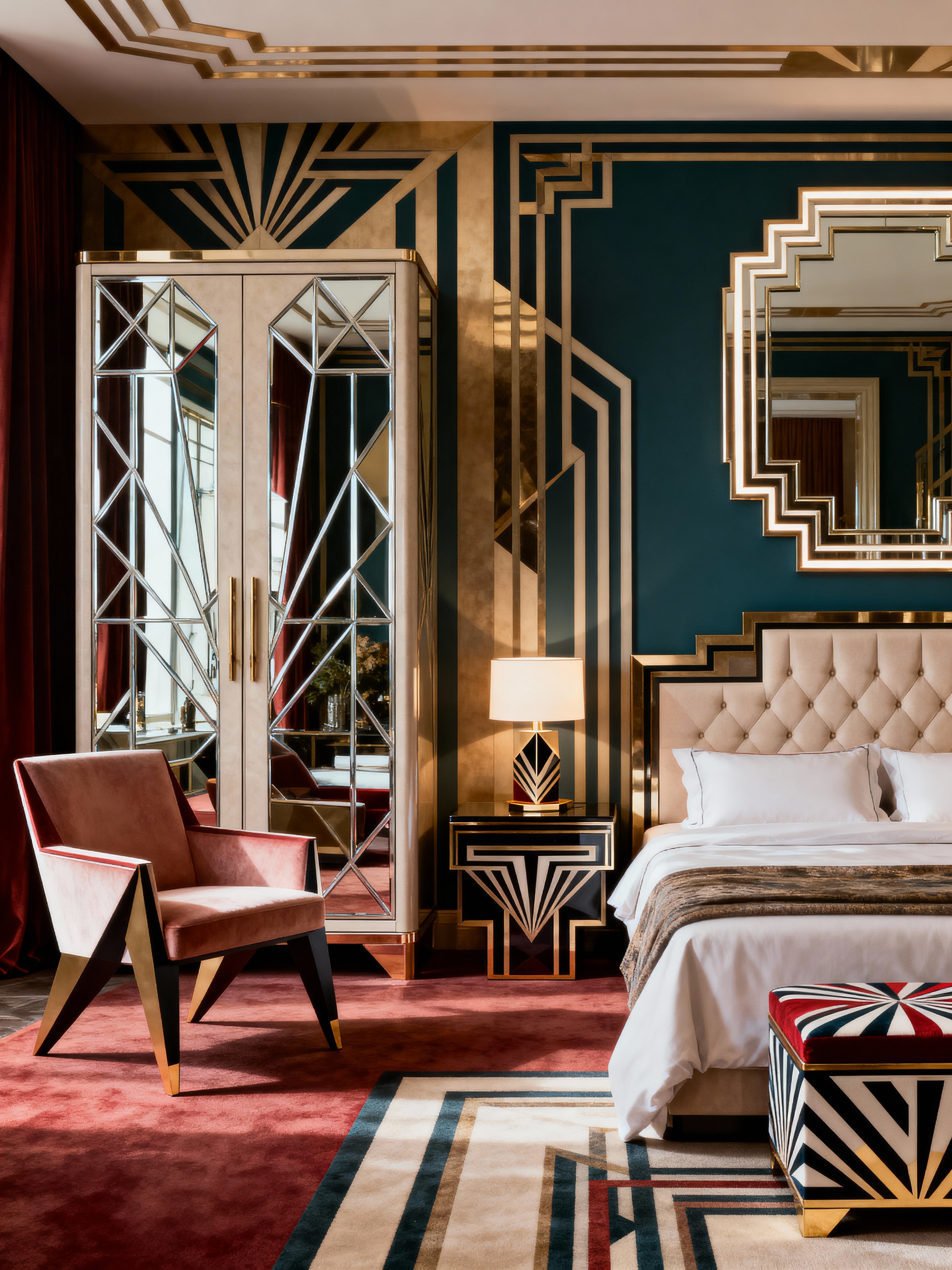 bedroom with art deco style with accent chair and dresser closet and headboard and bedside table or night stand and bed and mirror and night light and storage bench or ottoman. . with bold geometry and smooth lines and geometric shapes and luxury and symmetrical designs and exuberant shapes and stream-lined forms and rich colors
