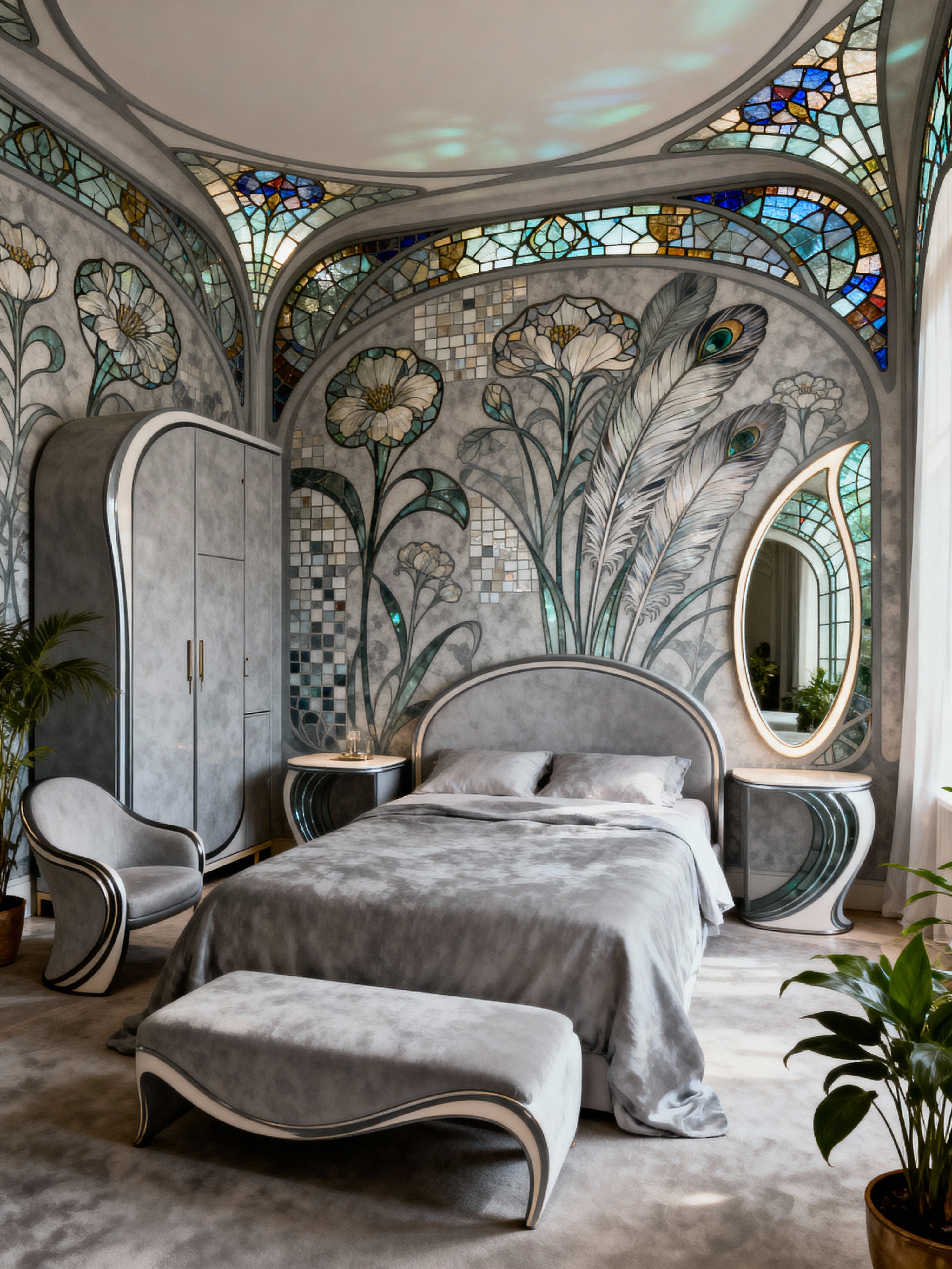 bedroom with art nouveau style with storage bench or ottoman and plant and mirror and dresser closet and accent chair and headboard and bed and bedside table or night stand. . with ashy colors and wallpaper patterns of stylized flowers and mosaics and asymmetrical shapes and wallpaper patterns of feathers and stained glass and arches and curved forms and curved glass