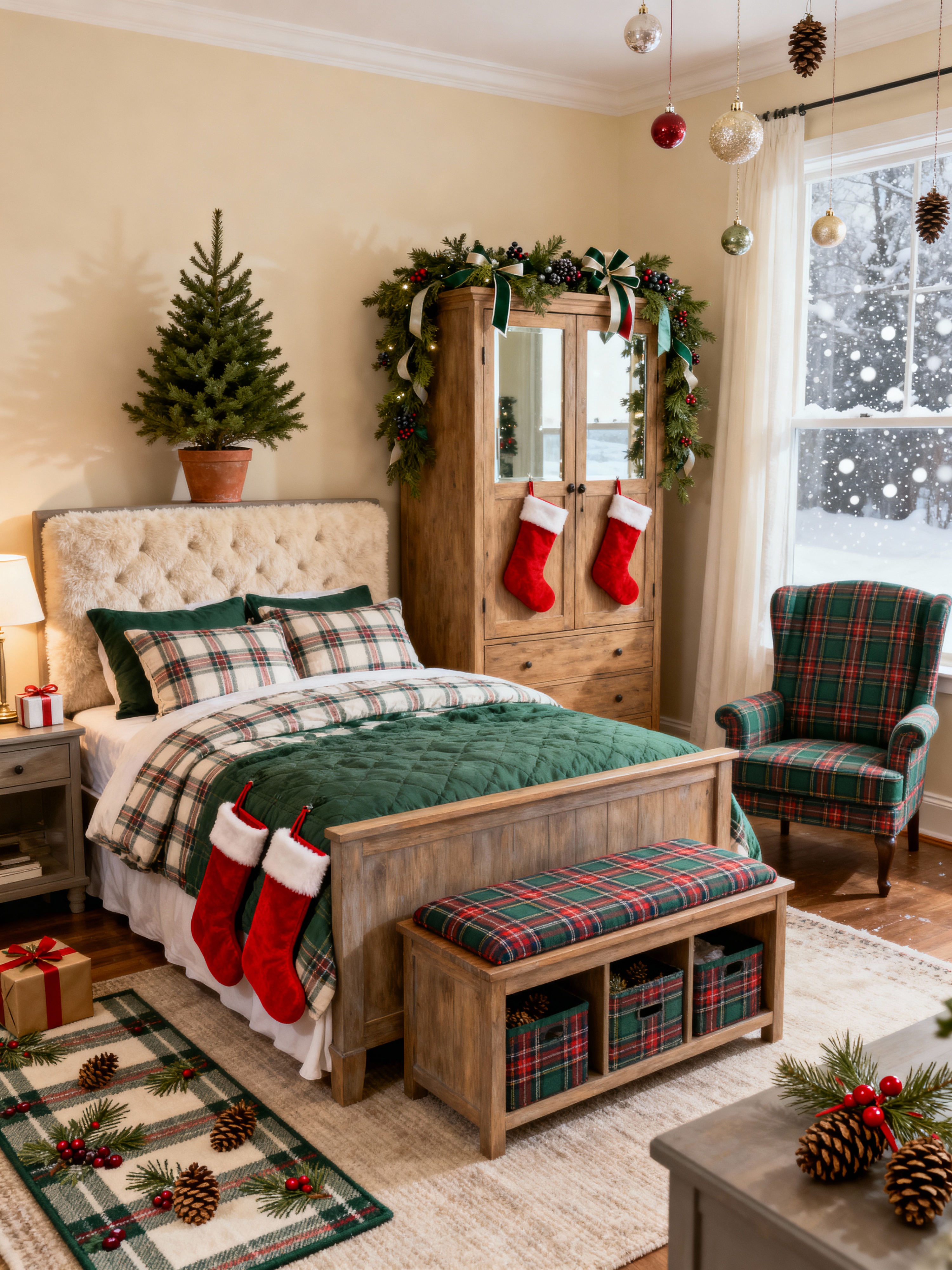 bedroom with christmas style with bed and plant and dresser closet and storage bench or ottoman and headboard and mirror and accent chair and bedside table or night stand. . with a few big socks hanging and snow outside and ribbons and berries and greenery draped and giftwrapped gifts and christmas ornaments and tie pinecones and berries and plaid rugs