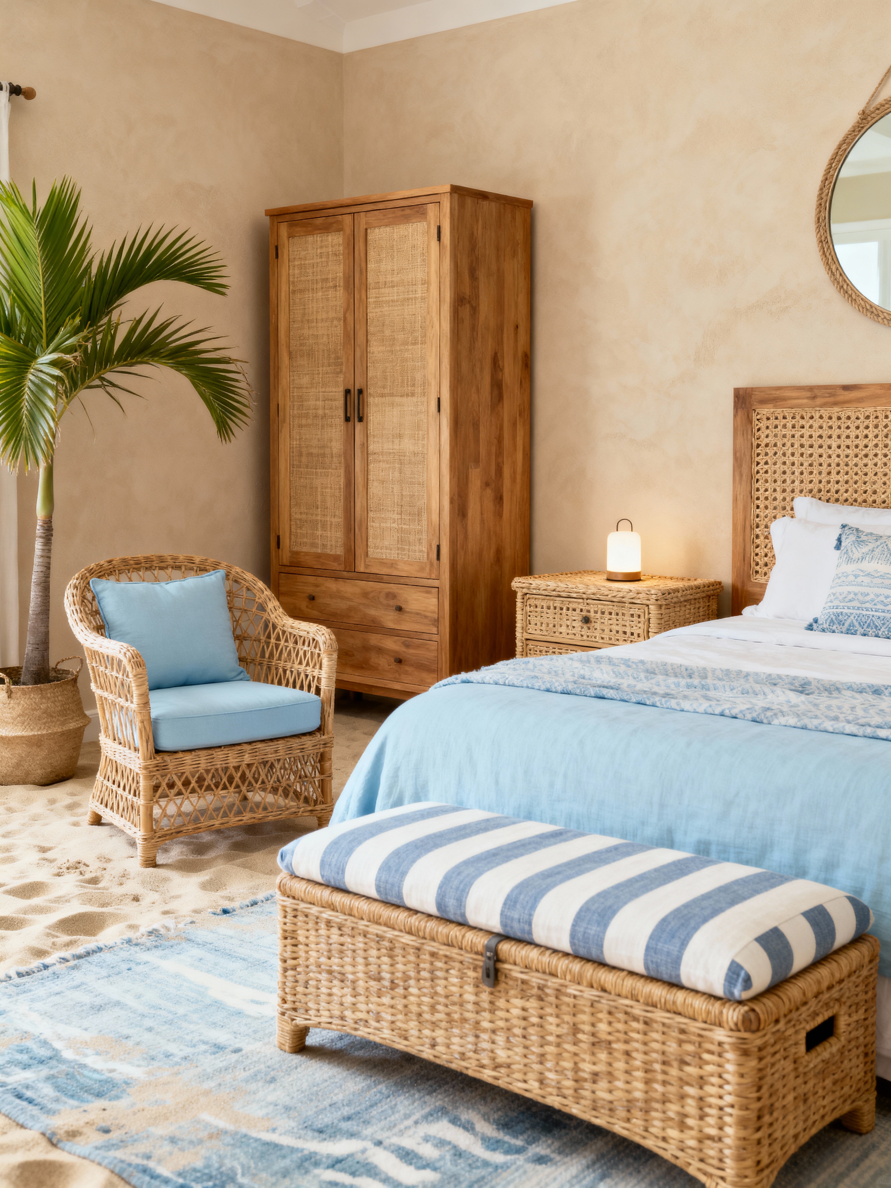 bedroom with coastal style with mirror and night light and storage bench or ottoman and accent chair and bedside table or night stand and dresser closet and plant and headboard. . with wicker furniture and sand tones and natural materials and ocean-inspired and seaside colors and beach vibes and light blue and relaxed style