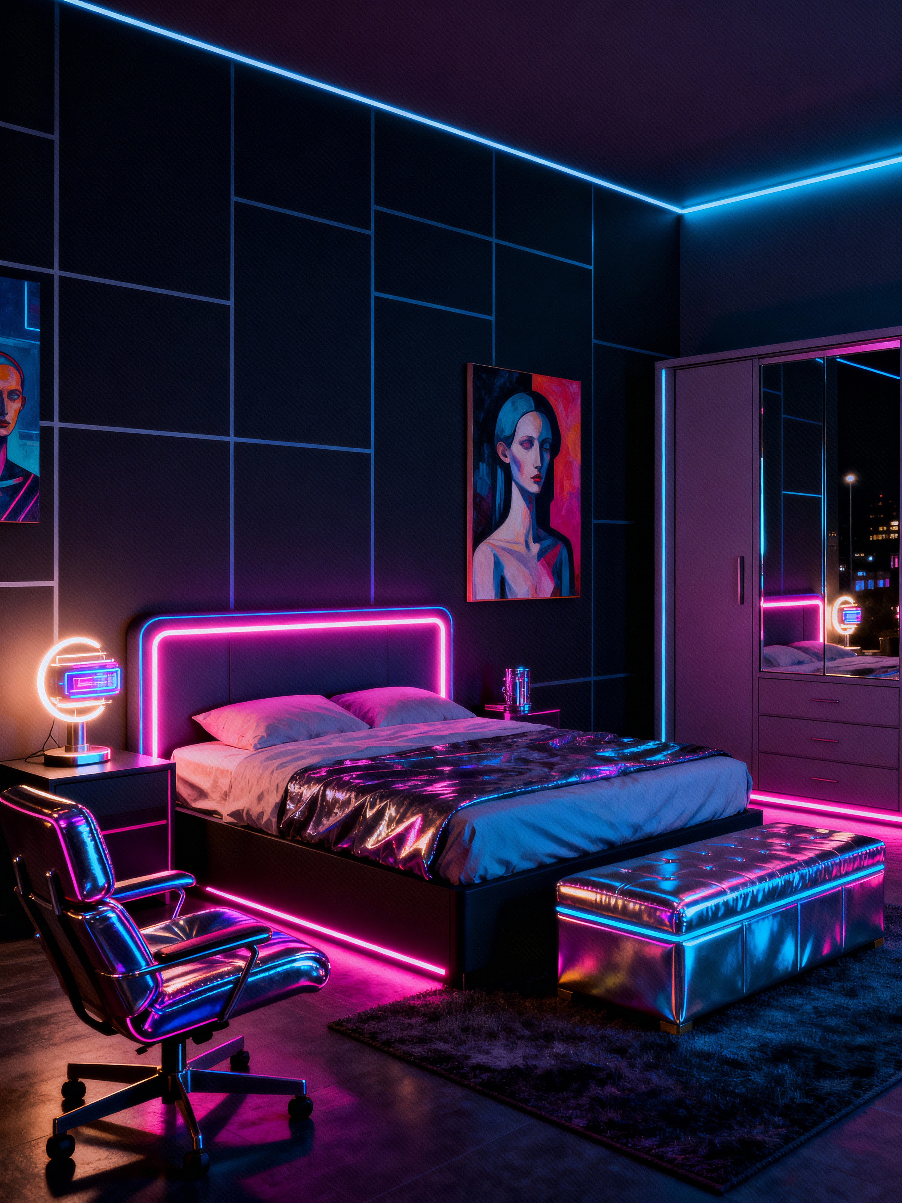 bedroom with cyberpunk style with accent chair and storage bench or ottoman and bed and bedside table or night stand and night light and dresser closet and mirror and headboard. . with synthwave and synthetic objects and strong geometric walls and cyberpunk lights and dark night and clean straight square lines and surrealist paintings and cyberpunk style