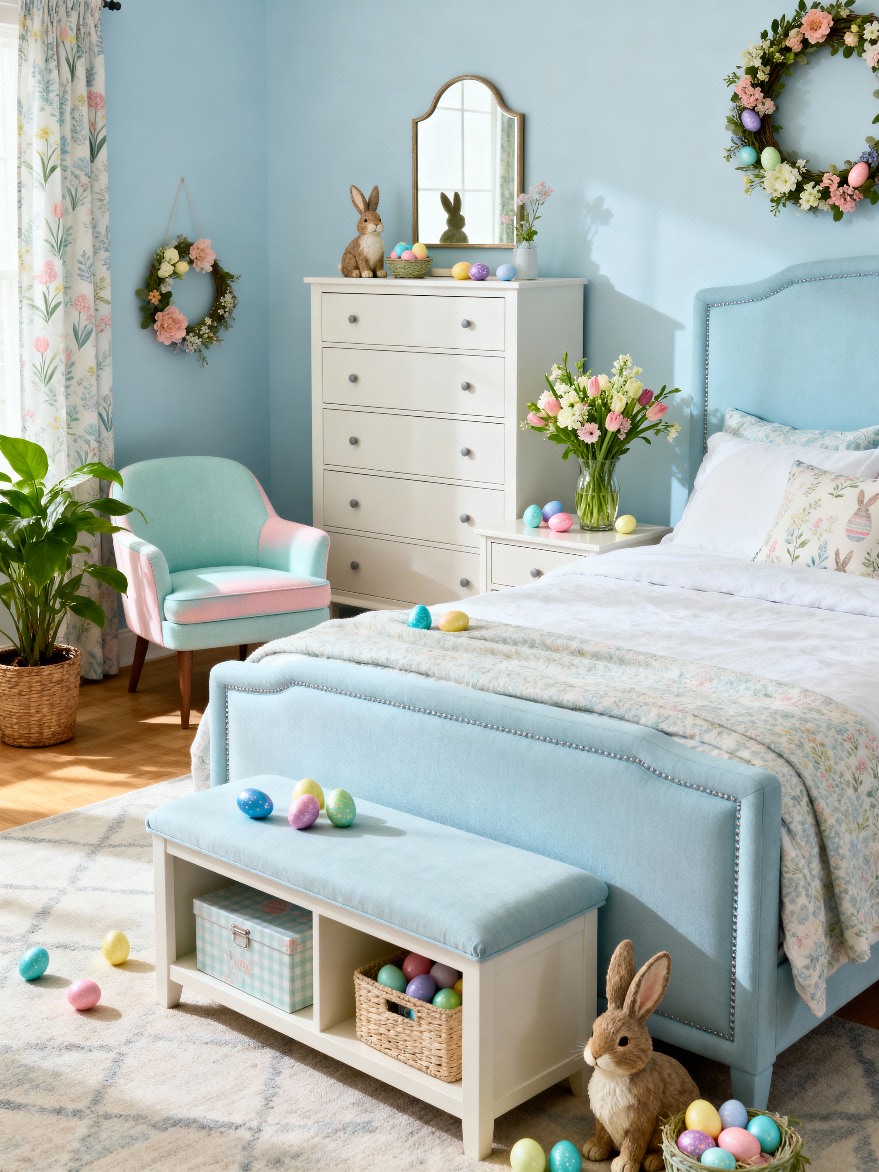 bedroom with easter style with mirror and accent chair and plant and dresser closet and headboard and storage bench or ottoman and bed and bedside table or night stand. . with flowers on table and easter decorations and colorful easter eggs and light blue colors and spring decorations and flowers on table