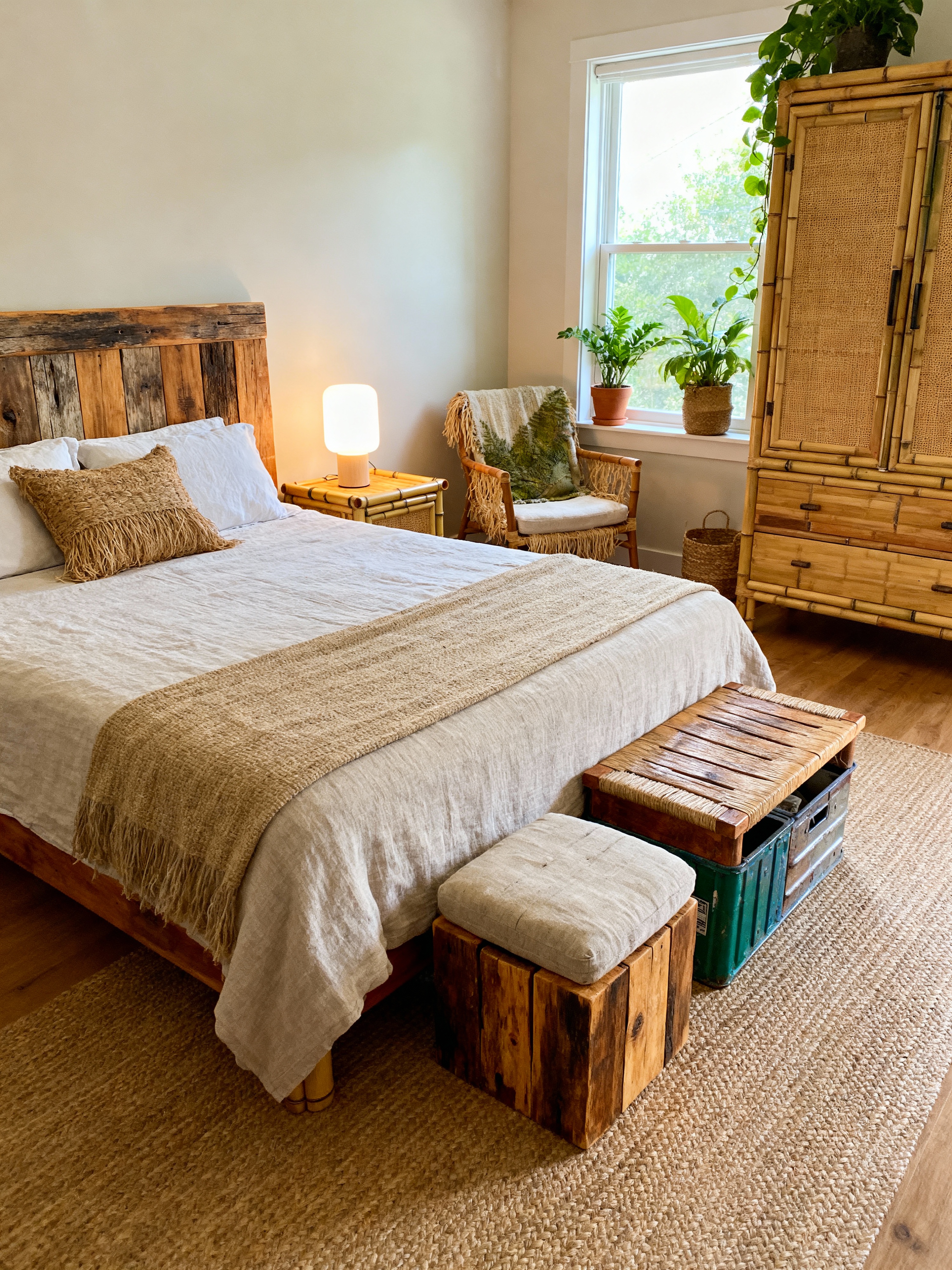 bedroom with eco-friendly style with plant and bedside table or night stand and storage bench or ottoman and accent chair and bed and headboard and dresser closet and night light. . with energy efficient and organic textiles and recycled elements and non-toxic finishes and reclaimed wood and bamboo furniture and green living and natural fibers