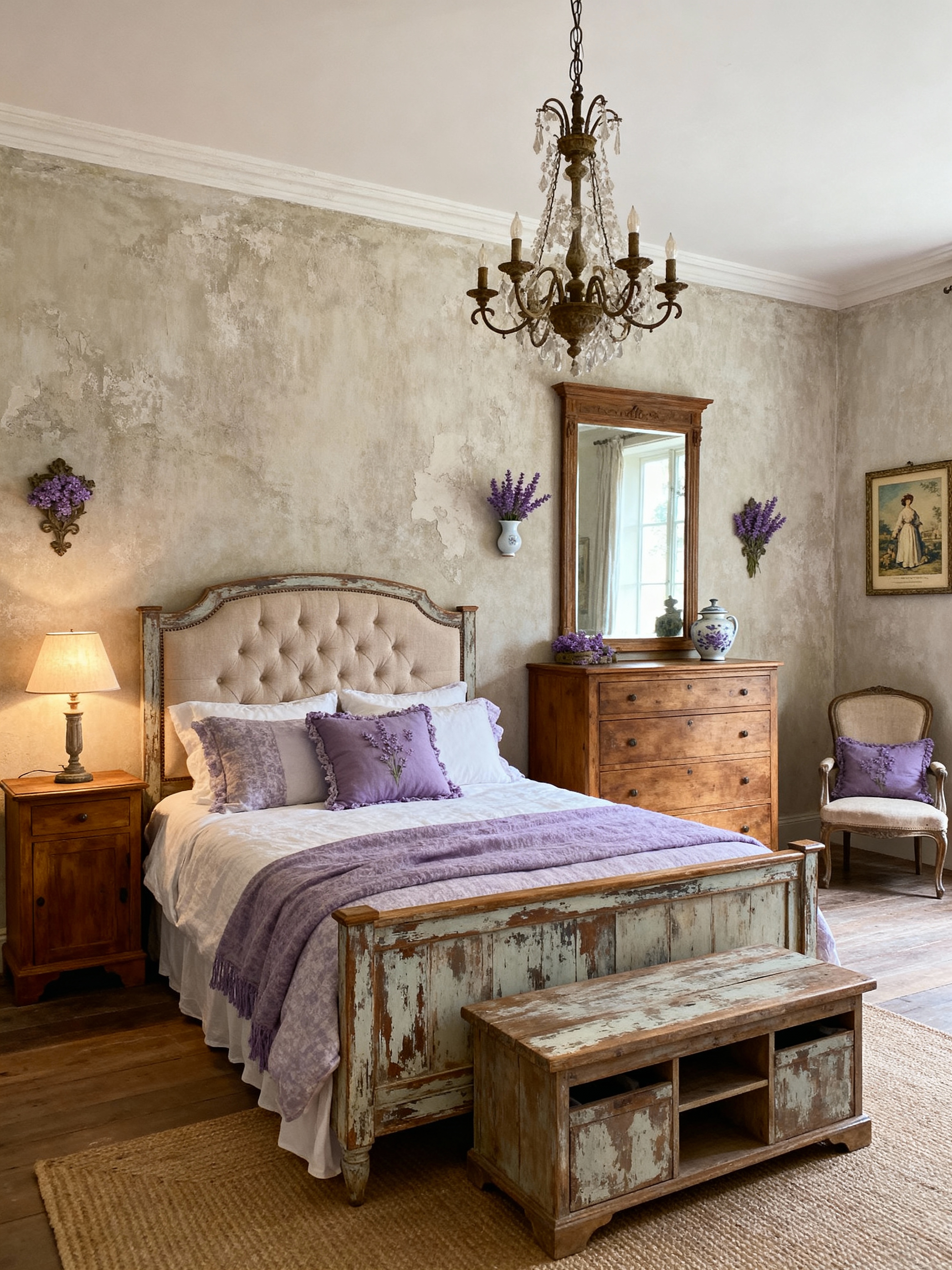 bedroom with french country style with dresser closet and mirror and night light and storage bench or ottoman and headboard and bed and bedside table or night stand and accent chair. . with distressed wood and chandeliers and country elegance and antique decor and lavender accents and vintage furniture and textured walls and soft fabrics
