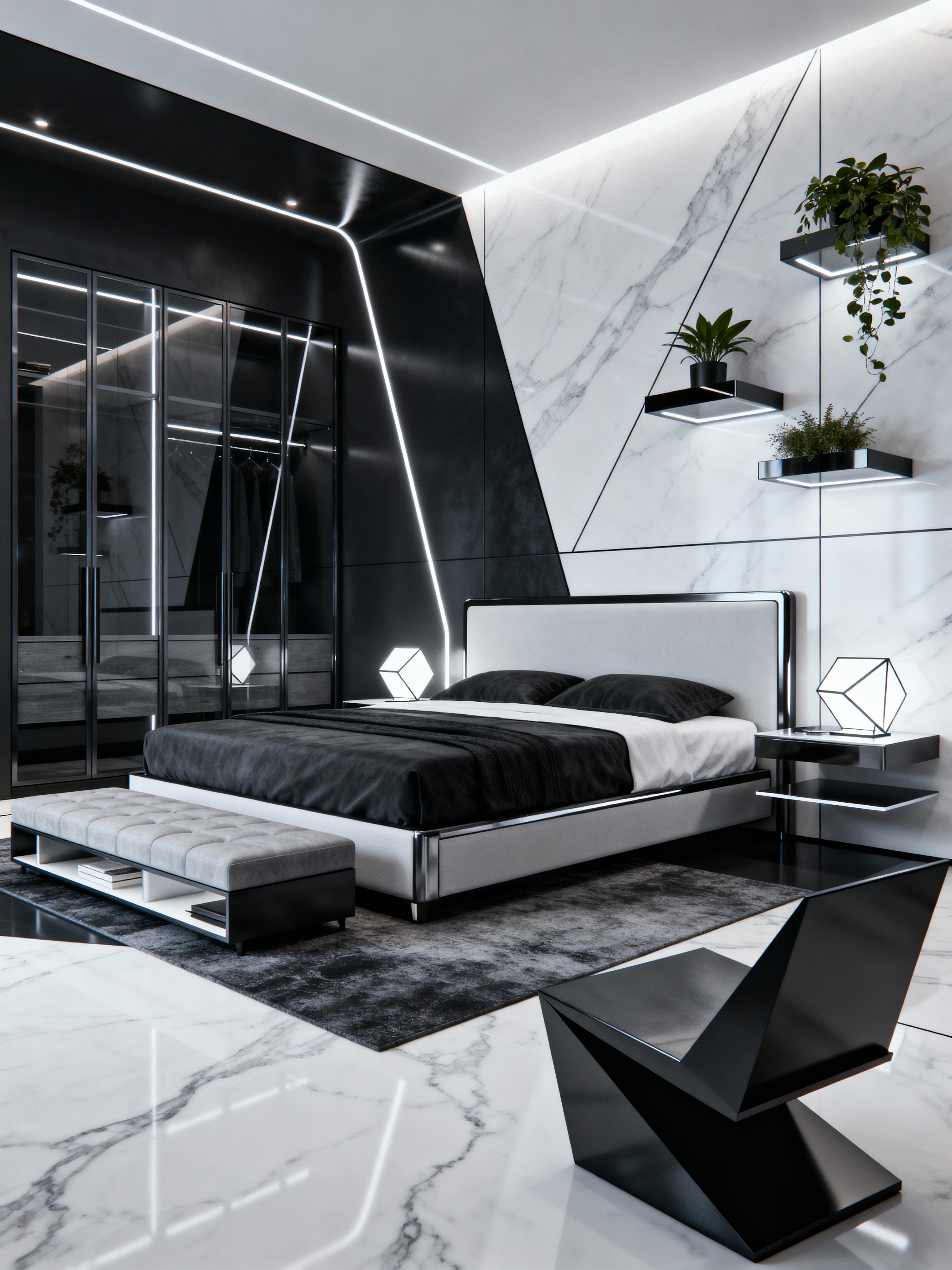 bedroom with futuristic style with plant and night light and headboard and dresser closet and storage bench or ottoman and accent chair and bedside table or night stand and bed. . with smooth marble and monochromatic palette and glass panes and floating surfaces and futurism and strong geometric walls and steel finishing and futuristic interior