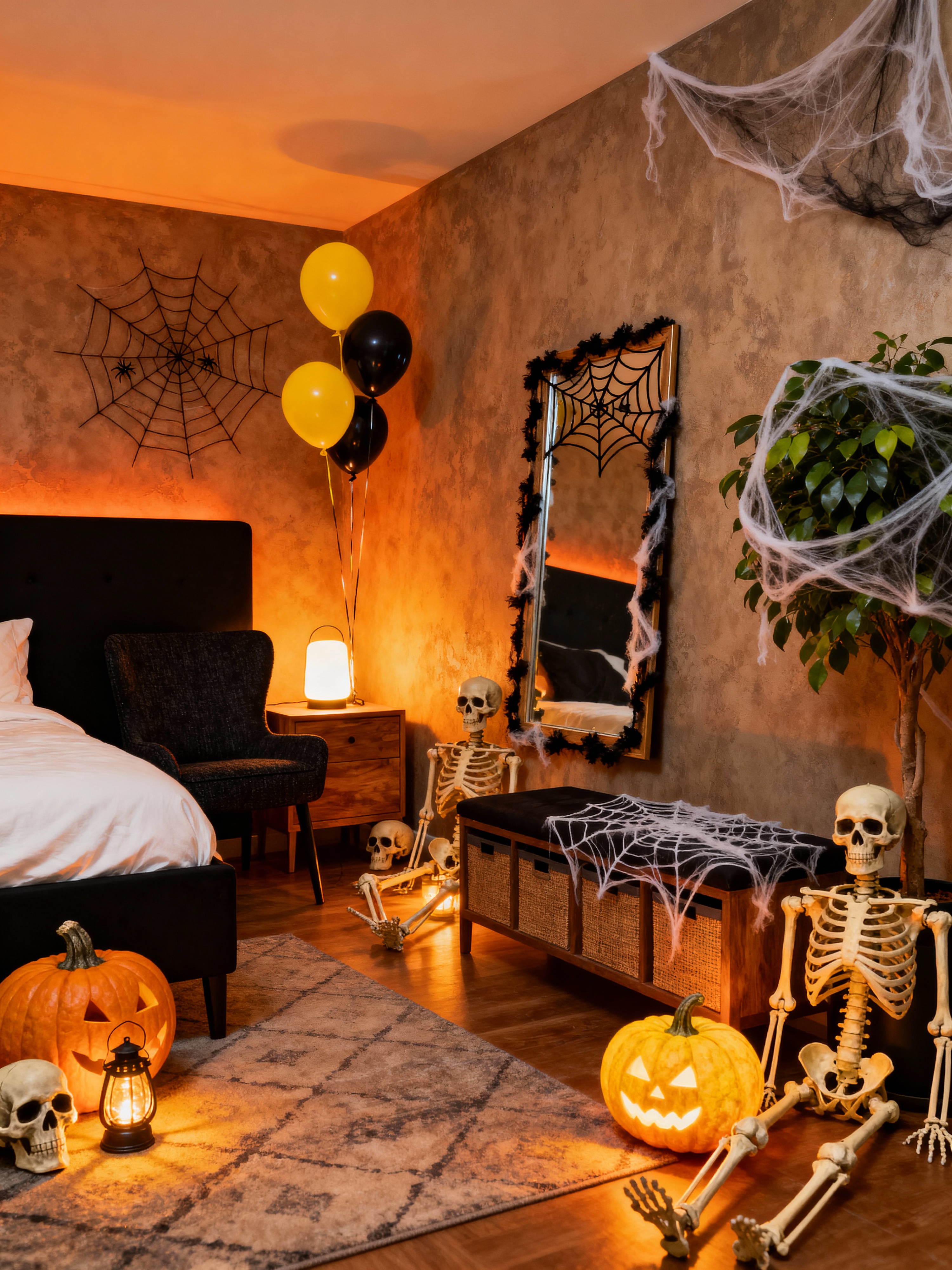 bedroom with halloween style with mirror and bedside table or night stand and night light and plant and bed and accent chair and storage bench or ottoman and headboard. . with glowing pumpkins and lanterns and human skulls and spiderwebs and cobwebs and skeletons sitting and standing and lanterns and yellow black balloons