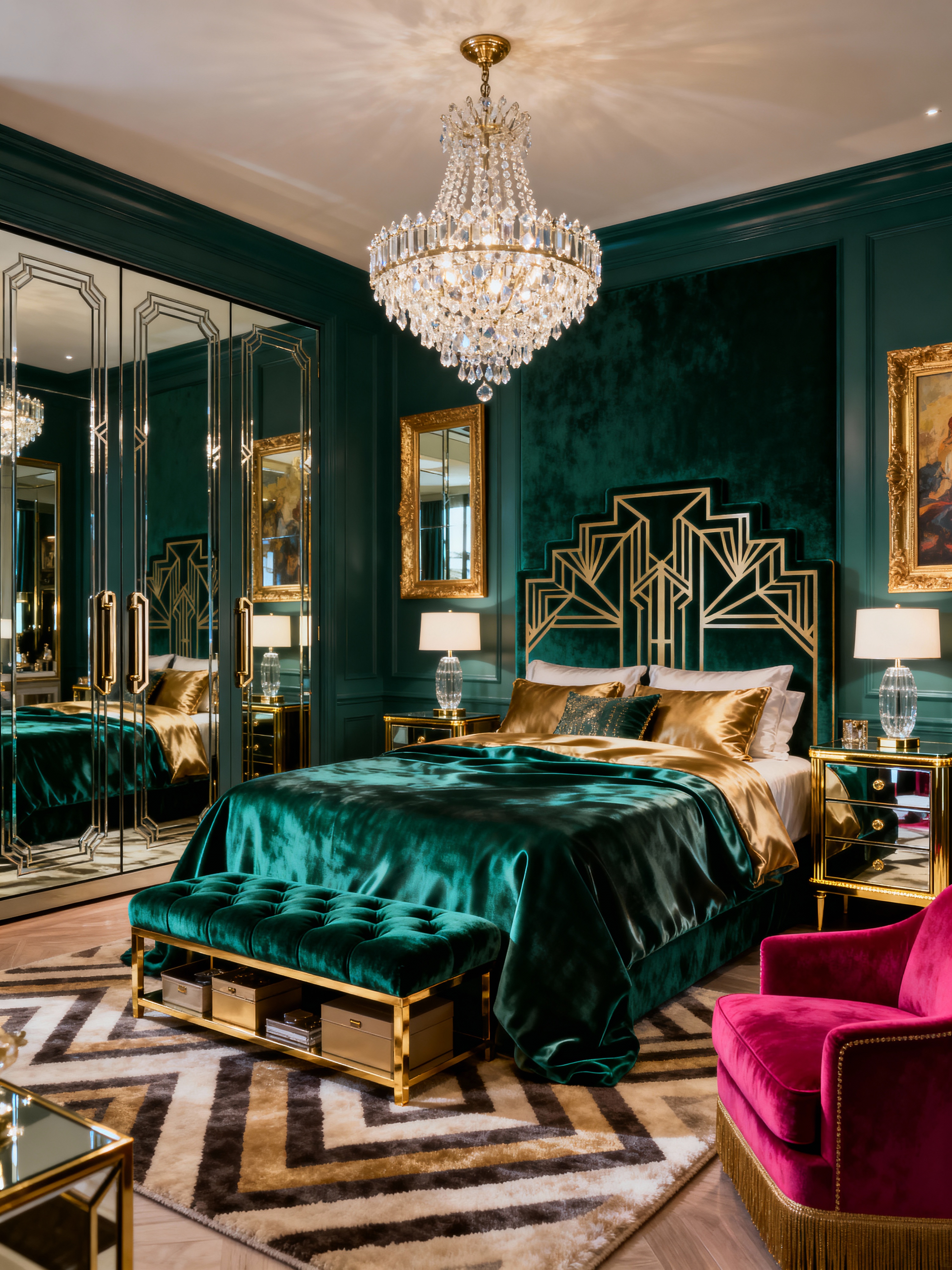 bedroom with hollywood glam style with plant and accent chair and headboard and dresser closet and night light and storage bench or ottoman and bed and bedside table or night stand. . with glamorous style and bold colors and crystal chandeliers and velvet upholstery and luxurious fabrics and art deco influence and opulent details and mirrored surfaces