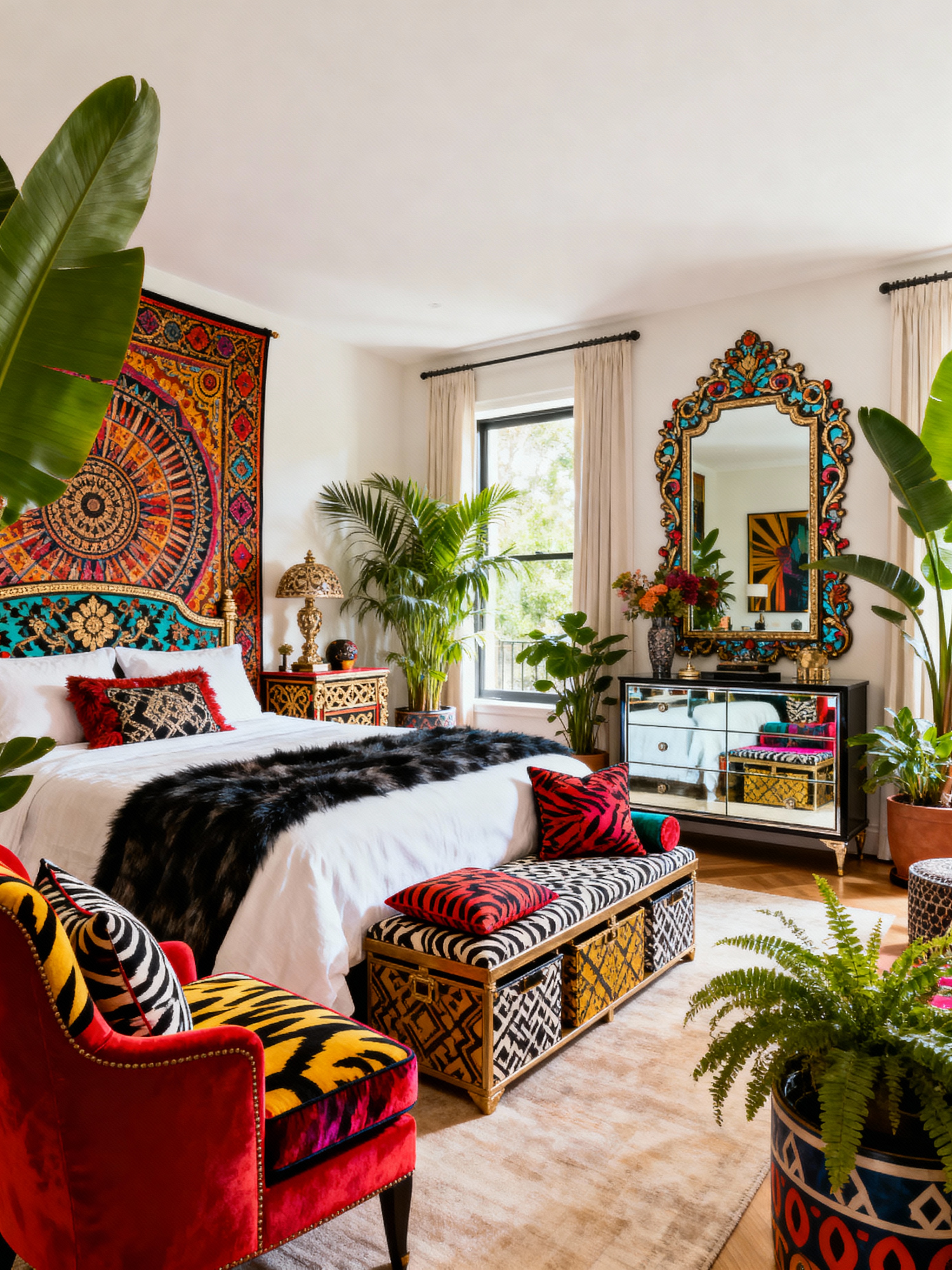 bedroom with maximalist style with plant and headboard and mirror and accent chair and bedside table or night stand and bed and storage bench or ottoman and dresser closet. . with eye-catching and over-the-top aesthetic and bold design and vibrant and bold patterns and bold creativity and bold colors and more is more philosophy