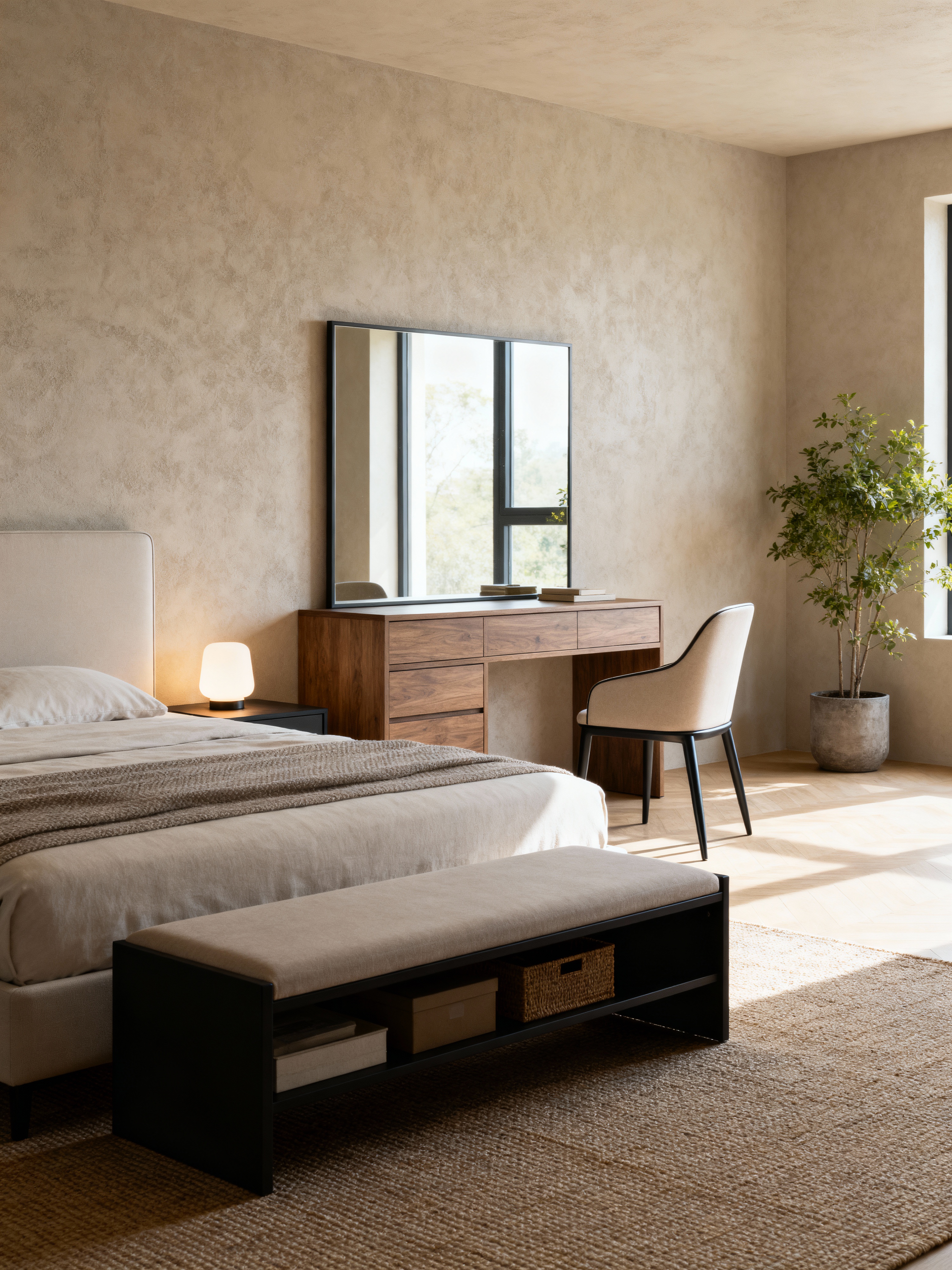 bedroom with modern style with accent chair and dresser closet and mirror and night light and bed and storage bench or ottoman and plant and headboard. . with open and natural lighting and simple, clean lines and simplistic furniture and natural materials and elements and neutral walls and textures and practicality and functionality and open and natural lighting