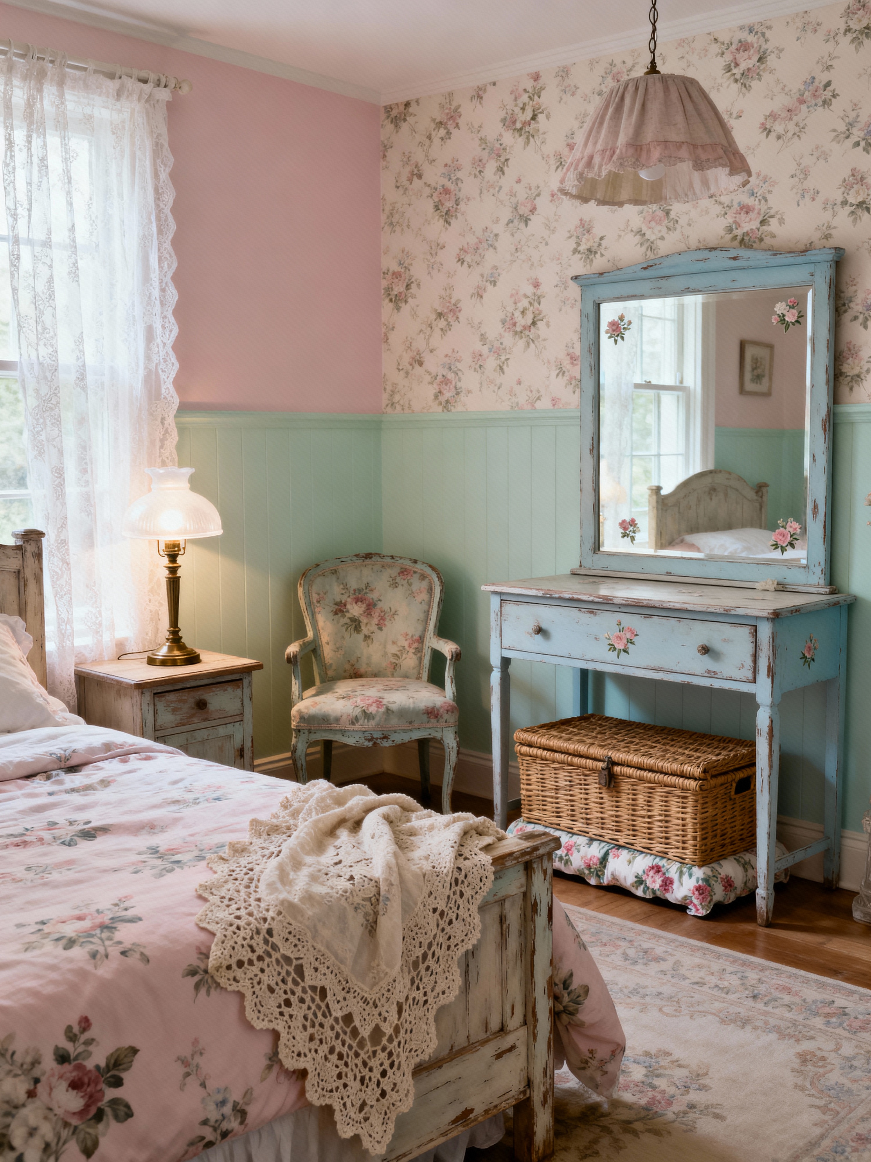 bedroom with shabby chic style with plant and bedside table or night stand and dresser closet and mirror and night light and bed and accent chair and storage bench or ottoman. . with weathered finishes and pastel colors and vintage charm and antique lace and cottage feel and distressed furniture and floral patterns and romantic style