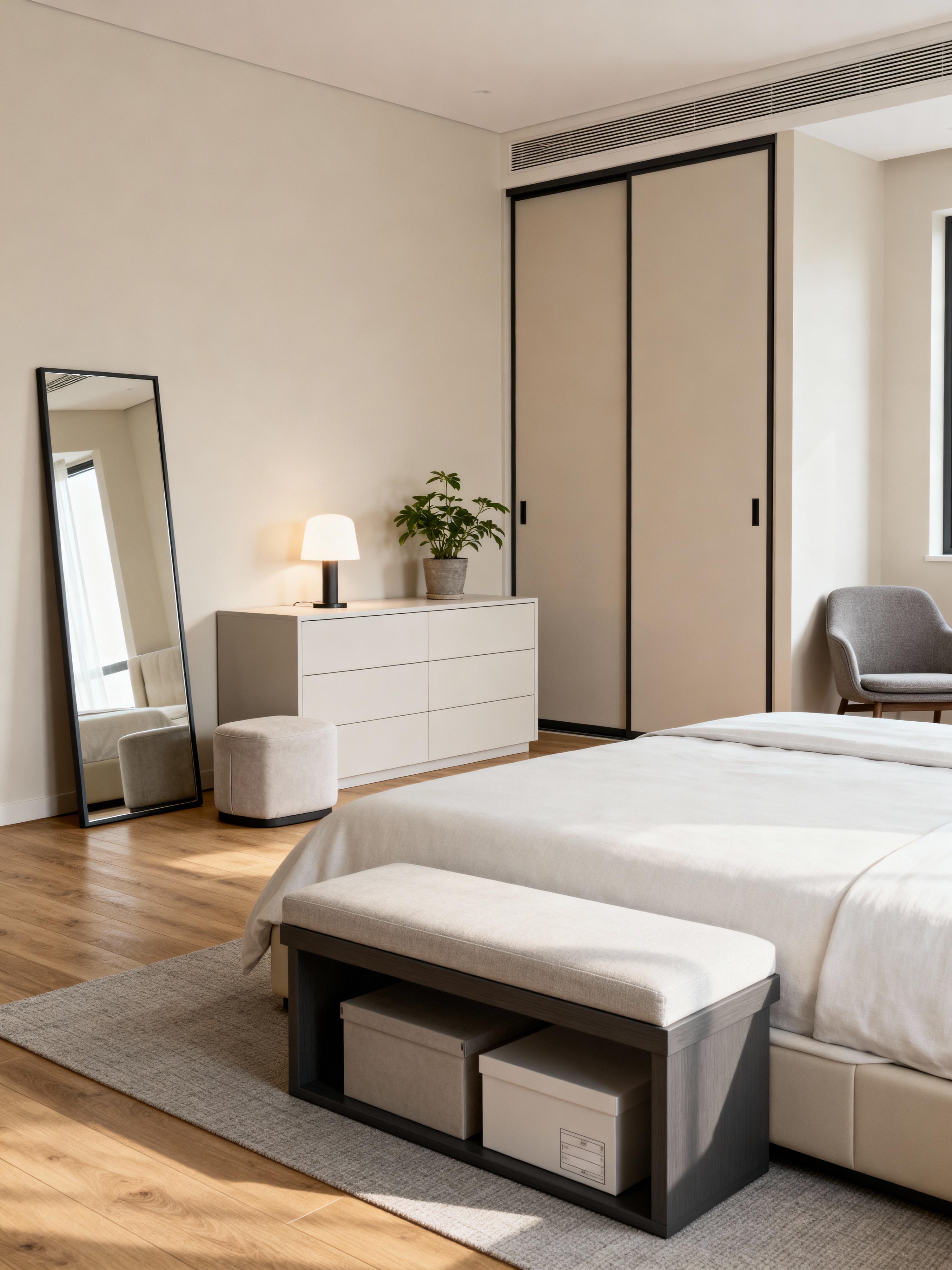 bedroom with simple style with bed and headboard and mirror and dresser closet and storage bench or ottoman and night light and plant and accent chair. . with minimal decor and uncluttered space and calm atmosphere and essential pieces and functional furniture and streamlined look and neutral colors and basic elements