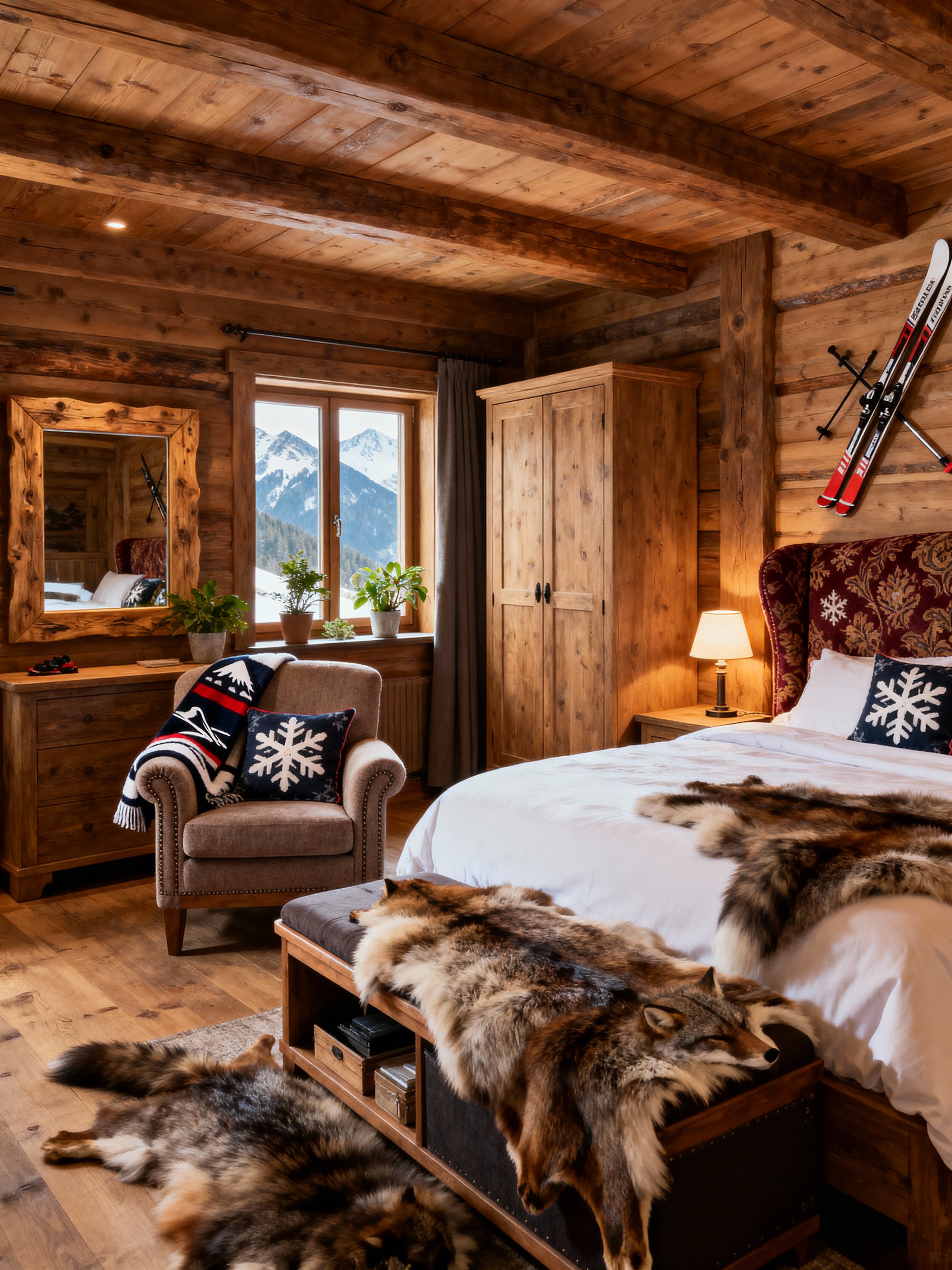 bedroom with ski chalet style with plant and bed and headboard and night light and accent chair and mirror and storage bench or ottoman and dresser closet. . with wood beams and richly patterned fabrics and ski-themed decor and animal furs and mountain-inspired and wooden walls and nature-inspired and window with mountain views