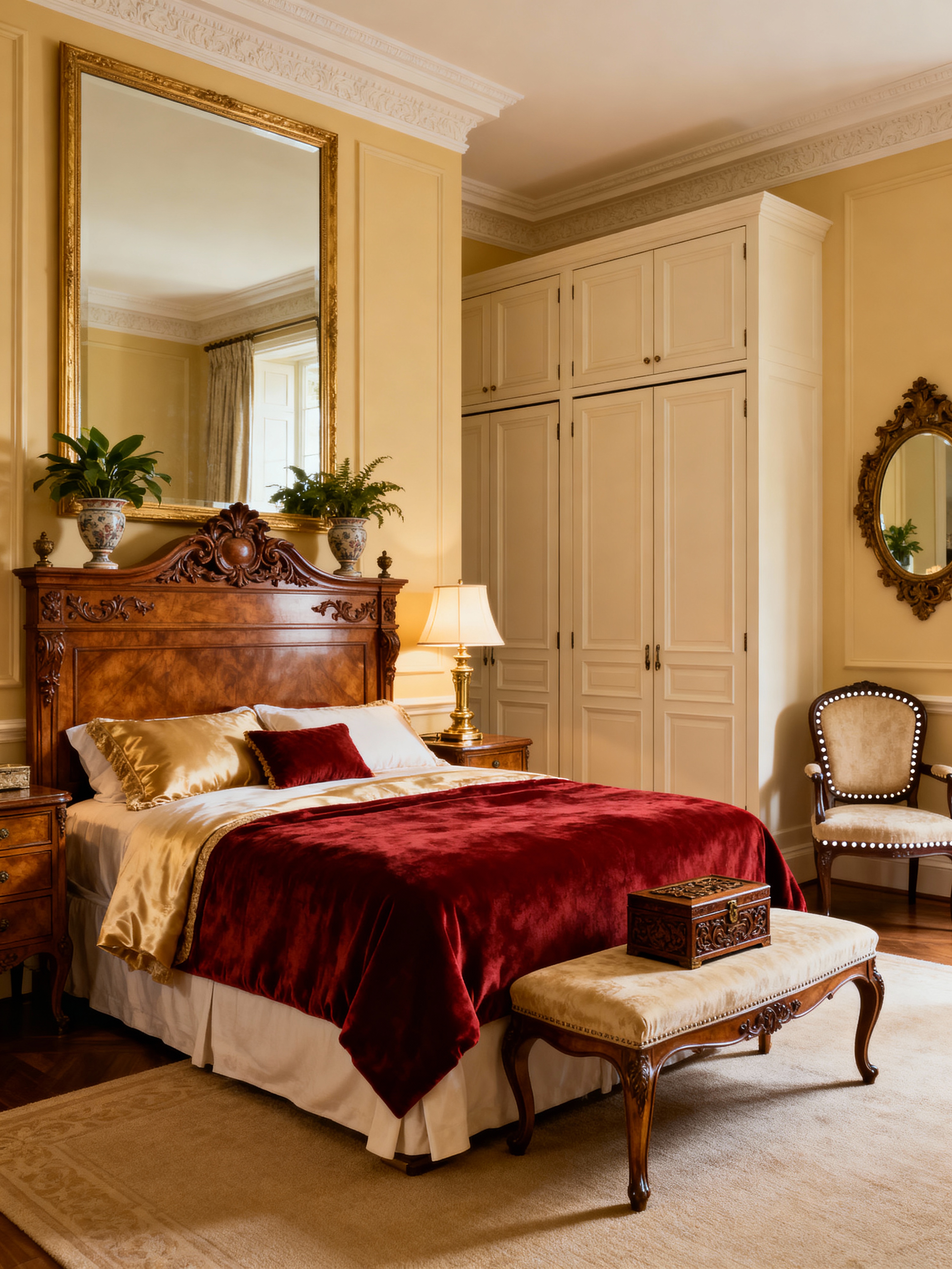 bedroom with traditional style with storage bench or ottoman and bed and dresser closet and accent chair and night light and plant and mirror and headboard. . with formal furniture and warm colors and refined atmosphere and antique pieces and luxurious textiles and classic elegance and timeless design and symmetrical layout
