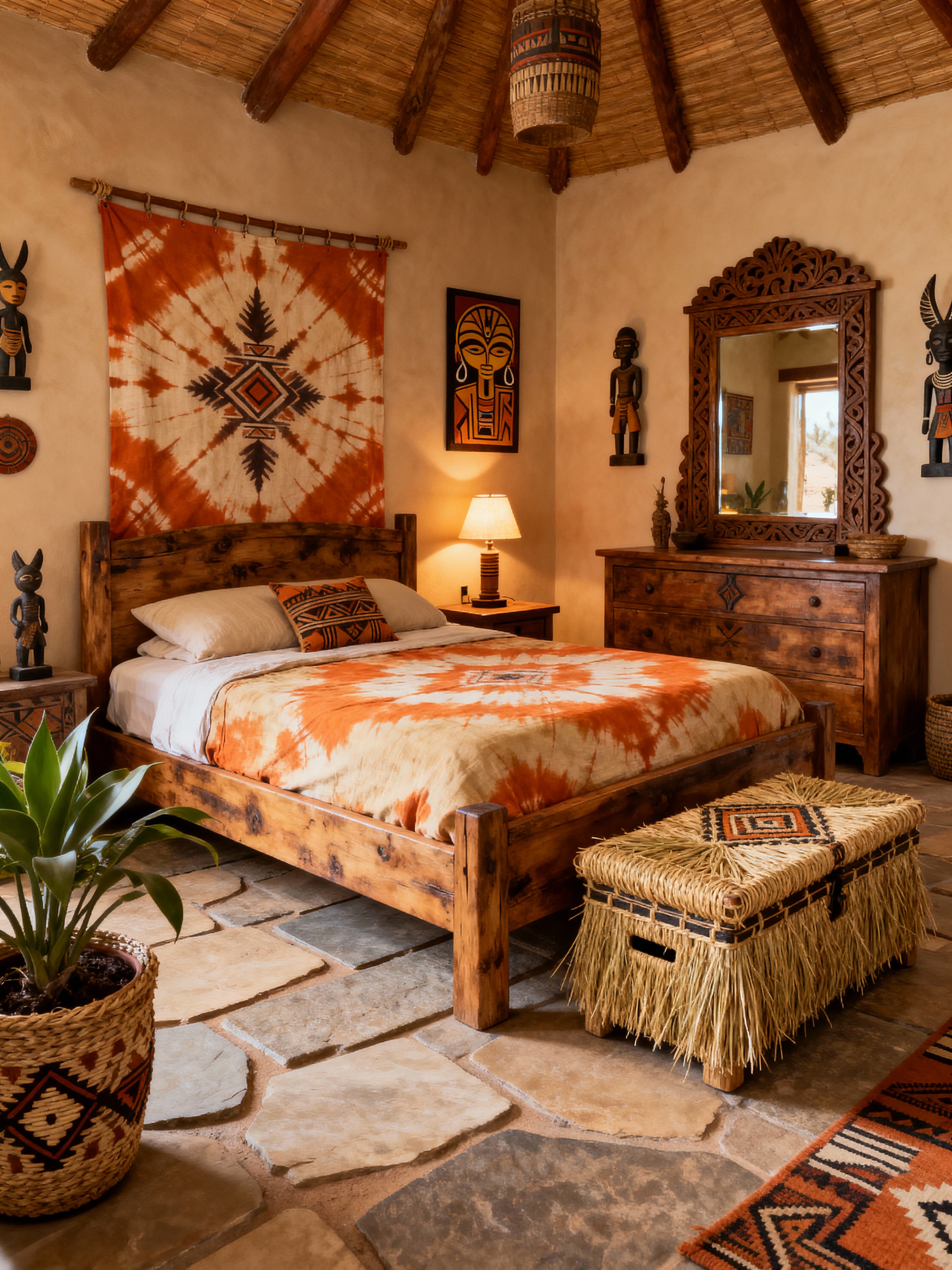 bedroom with tribal style with night light and headboard and dresser closet and bedside table or night stand and mirror and bed and storage bench or ottoman and plant. . with tribal revival and planks of stone and hand dyed batik fabrics and smooth worn timbers and sculptures and artworks and desert colours and tribal patterns and intricate grass weaving