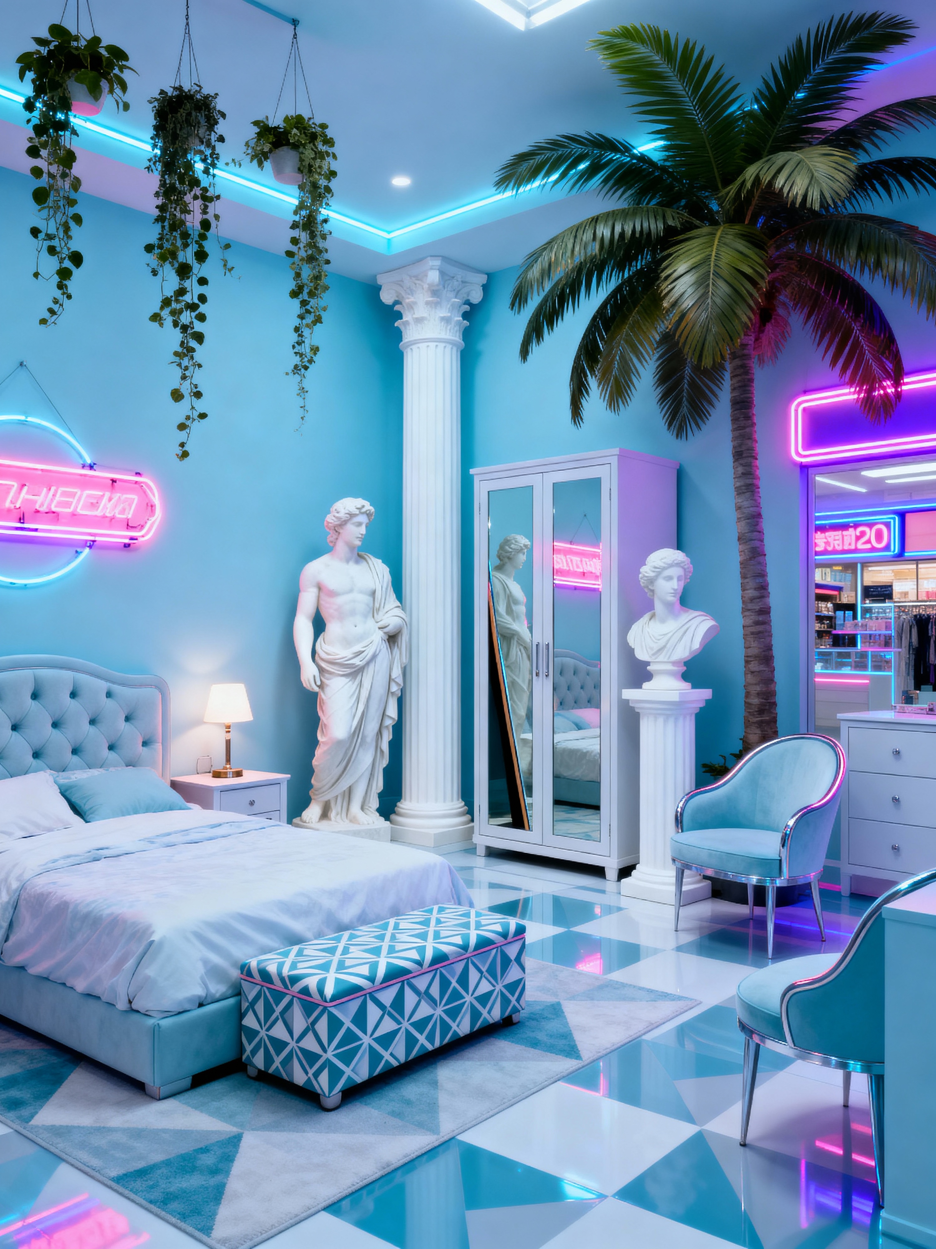 bedroom with vaporwave style with bedside table or night stand and storage bench or ottoman and plant and accent chair and bed and mirror and night light and dresser closet. . with baby blue and white roman statues, white roman sculptures, white roman columns, white roman pillars in the center of the room, and 1980s retail shops and hanging plants and palm trees and palm trees and bright pink and purple lights