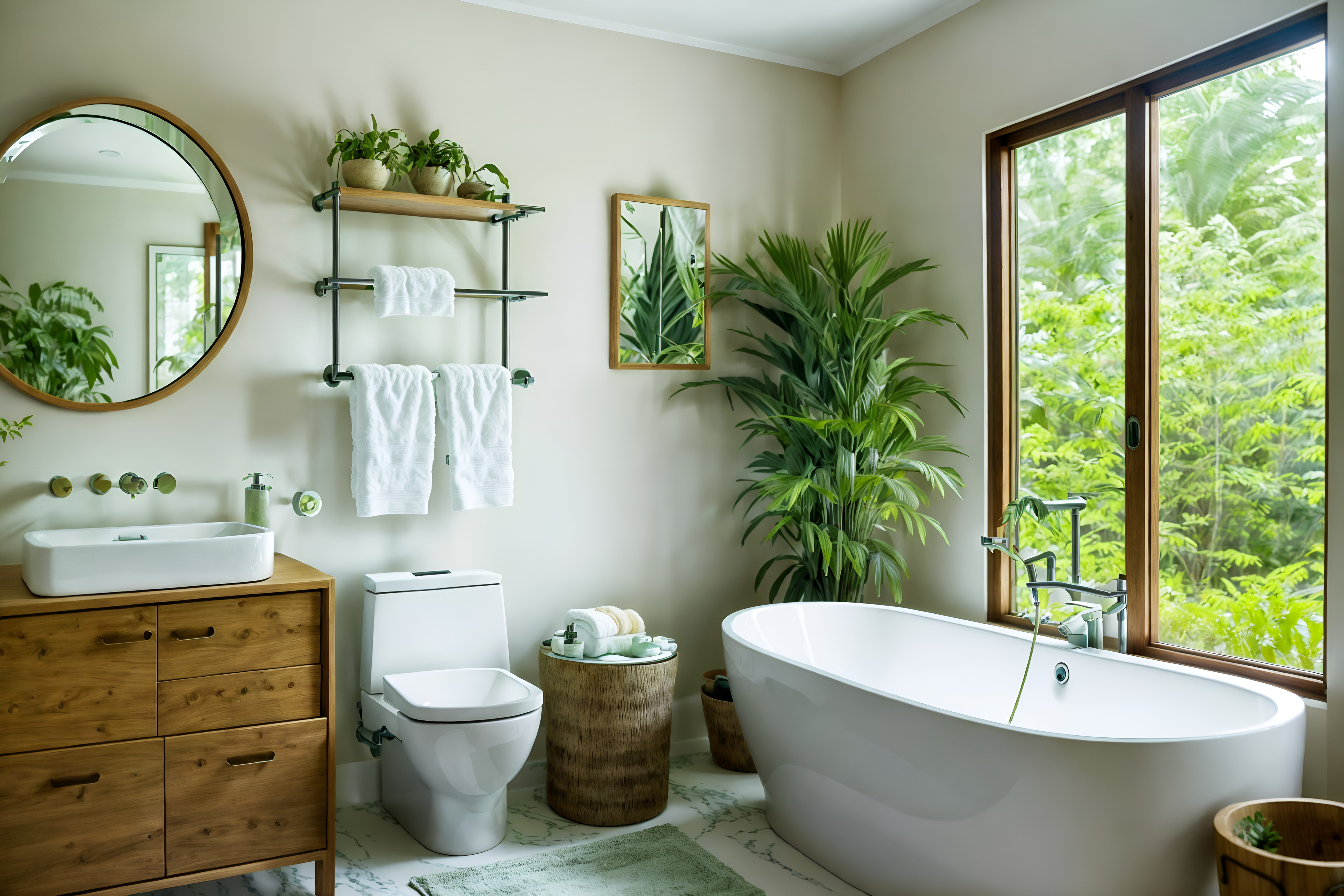 photo from pinterest of biophilic-style interior designed (bathroom interior) with bathroom cabinet and bath rail and mirror and toilet seat and bath towel and plant and bathroom sink with faucet and shower. . with features of the natural world and linen materials and images of animals and natural environment and earthy colors and natural elements and natural shapes and forms and calming style. . cinematic photo, highly detailed, cinematic lighting, ultra-detailed, ultrarealistic, photorealism, 8k. trending on pinterest. biophilic interior design style. masterpiece, cinematic light, ultrarealistic+, photorealistic+, 8k, raw photo, realistic, sharp focus on eyes, (symmetrical eyes), (intact eyes), hyperrealistic, highest quality, best quality, , highly detailed, masterpiece, best quality, extremely detailed 8k wallpaper, masterpiece, best quality, ultra-detailed, best shadow, detailed background, detailed face, detailed eyes, high contrast, best illumination, detailed face, dulux, caustic, dynamic angle, detailed glow. dramatic lighting. highly detailed, insanely detailed hair, symmetrical, intricate details, professionally retouched, 8k high definition. strong bokeh. award winning photo.