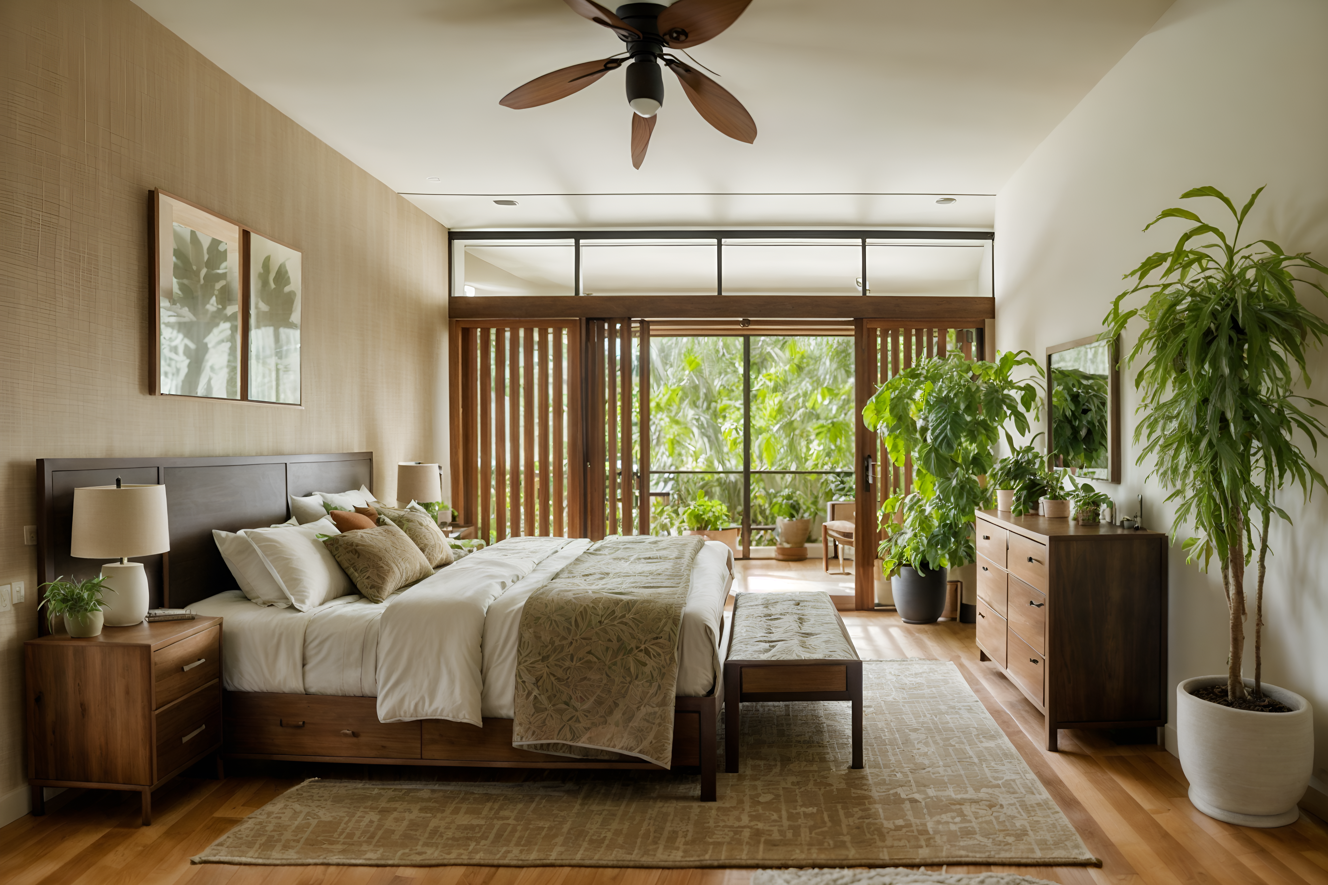 Photo from Pinterest of Biophilic-style interior designed (bedroom interior) With accent chair and bed and headboard and bedside table or night stand and dresser closet and night light and plant and storage bench or ottoman. . With plants and earthy colors and ceramic materials and Environmental features and Natural patterns and natural elements and images of animals and natural environment. . Cinematic photo, highly detailed, cinematic lighting, ultra-detailed, ultrarealistic, photorealism, 8k. Trending on Pinterest. Biophilic interior design style