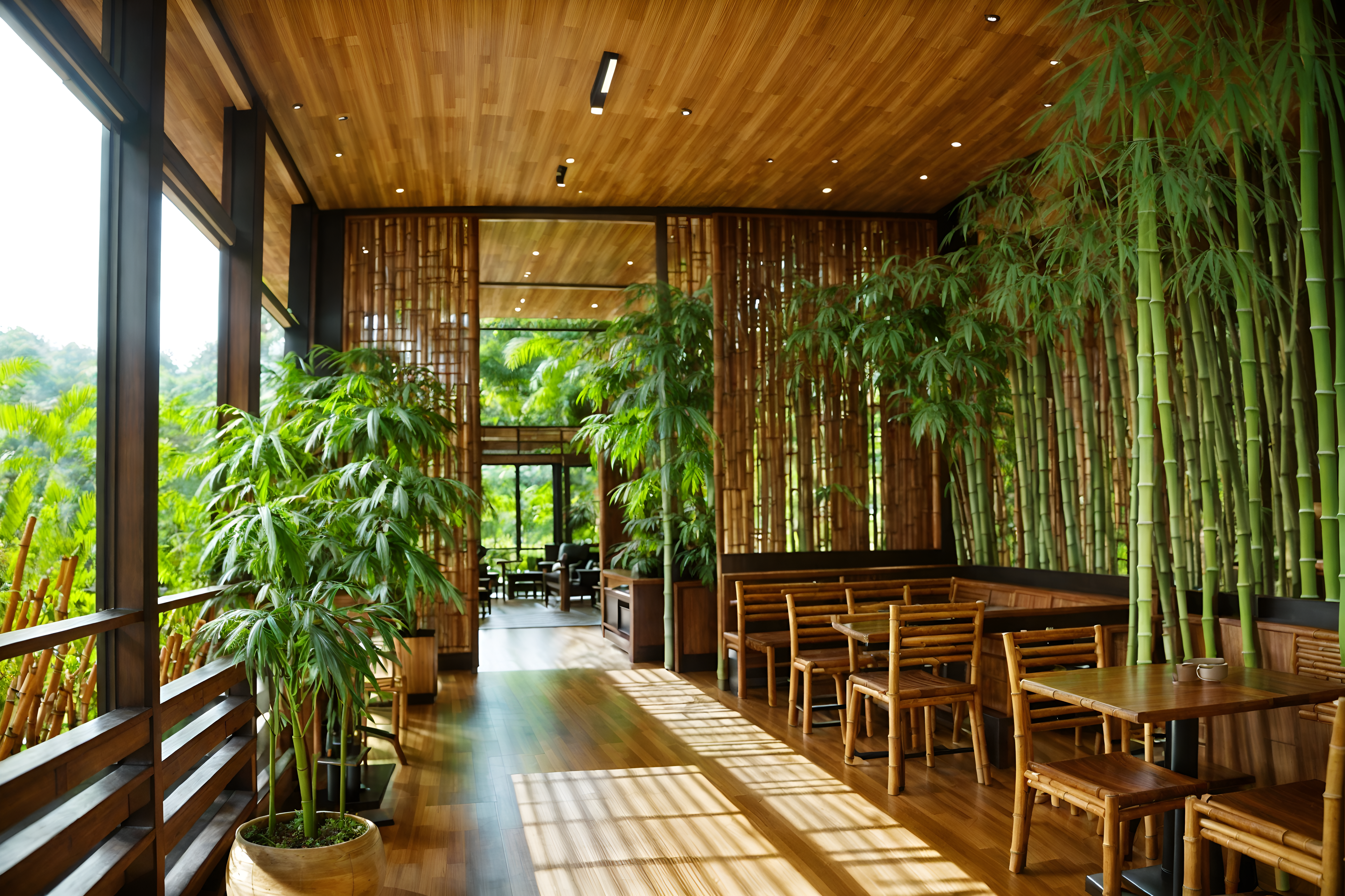 photo from pinterest of biophilic-style interior designed (coffee shop interior) . with features of nature and natural patterns and sunlight and bamboo materials and natural shapes and forms and fresh air and natural environment and plants. . cinematic photo, highly detailed, cinematic lighting, ultra-detailed, ultrarealistic, photorealism, 8k. trending on pinterest. biophilic interior design style. masterpiece, cinematic light, ultrarealistic+, photorealistic+, 8k, raw photo, realistic, sharp focus on eyes, (symmetrical eyes), (intact eyes), hyperrealistic, highest quality, best quality, , highly detailed, masterpiece, best quality, extremely detailed 8k wallpaper, masterpiece, best quality, ultra-detailed, best shadow, detailed background, detailed face, detailed eyes, high contrast, best illumination, detailed face, dulux, caustic, dynamic angle, detailed glow. dramatic lighting. highly detailed, insanely detailed hair, symmetrical, intricate details, professionally retouched, 8k high definition. strong bokeh. award winning photo.
