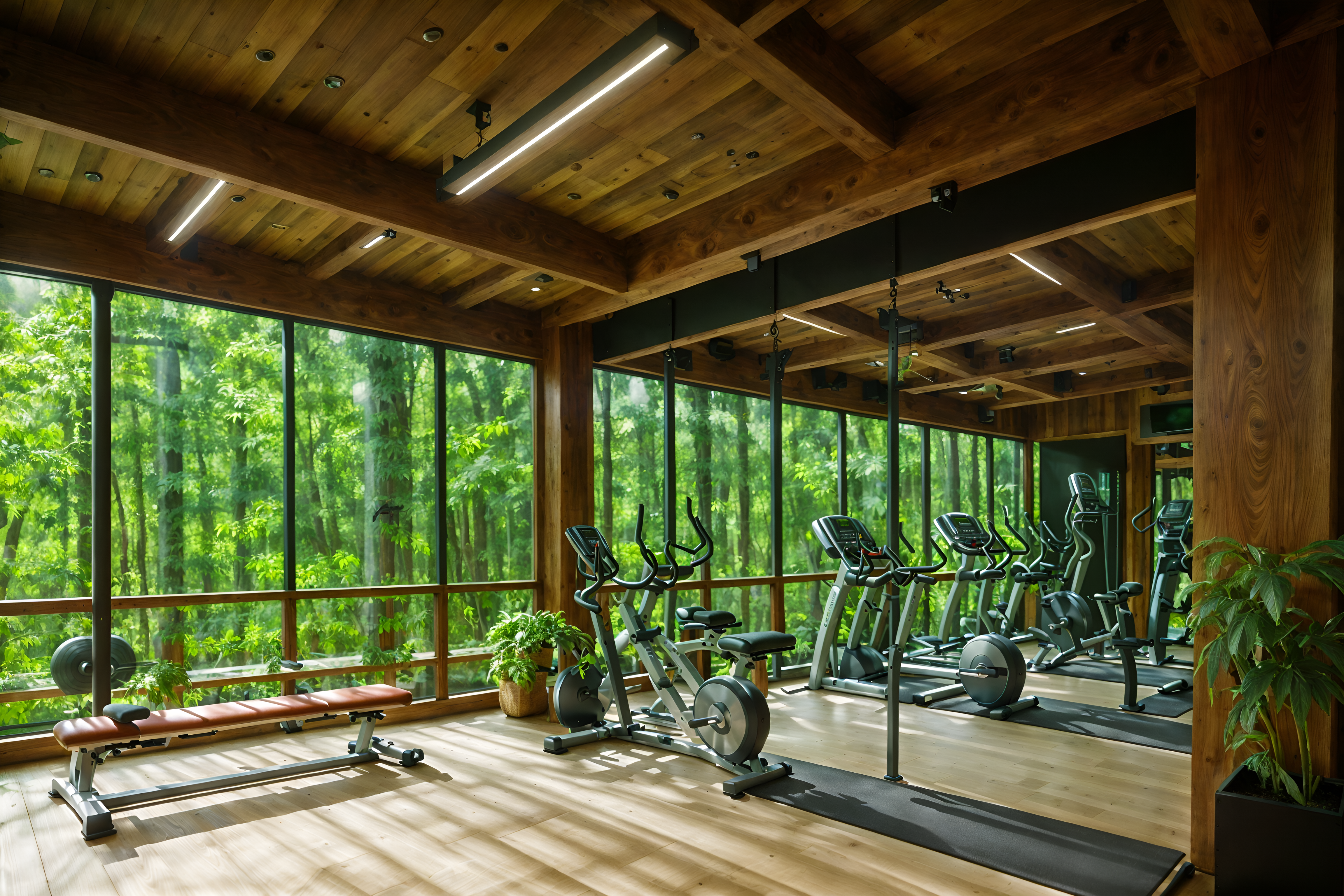 photo from pinterest of biophilic-style interior designed (fitness gym interior) with exercise bicycle and bench press and squat rack and crosstrainer and dumbbell stand and exercise bicycle. . with natural elements and calming style and wood materials and natural environment and fresh air and plants and natural patterns and features of nature. . cinematic photo, highly detailed, cinematic lighting, ultra-detailed, ultrarealistic, photorealism, 8k. trending on pinterest. biophilic interior design style. masterpiece, cinematic light, ultrarealistic+, photorealistic+, 8k, raw photo, realistic, sharp focus on eyes, (symmetrical eyes), (intact eyes), hyperrealistic, highest quality, best quality, , highly detailed, masterpiece, best quality, extremely detailed 8k wallpaper, masterpiece, best quality, ultra-detailed, best shadow, detailed background, detailed face, detailed eyes, high contrast, best illumination, detailed face, dulux, caustic, dynamic angle, detailed glow. dramatic lighting. highly detailed, insanely detailed hair, symmetrical, intricate details, professionally retouched, 8k high definition. strong bokeh. award winning photo.