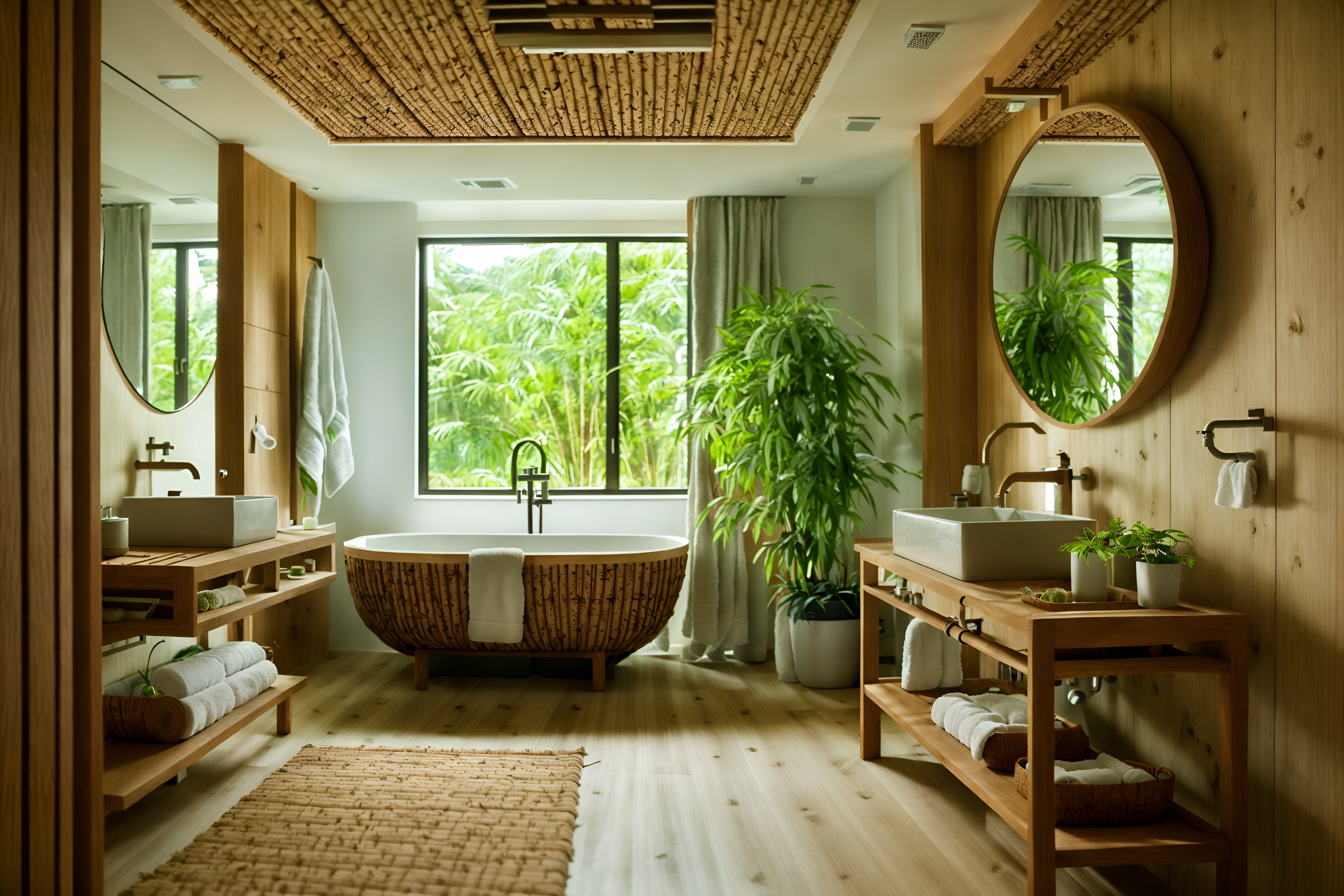 photo from pinterest of biophilic-style interior designed (hotel bathroom interior) with plant and waste basket and bathtub and bathroom cabinet and mirror and bath rail and toilet seat and shower. . with natural elements and wood materials and cork materials and linen materials and sunlight and natural shapes and forms and images of animals and natural environment. . cinematic photo, highly detailed, cinematic lighting, ultra-detailed, ultrarealistic, photorealism, 8k. trending on pinterest. biophilic interior design style. masterpiece, cinematic light, ultrarealistic+, photorealistic+, 8k, raw photo, realistic, sharp focus on eyes, (symmetrical eyes), (intact eyes), hyperrealistic, highest quality, best quality, , highly detailed, masterpiece, best quality, extremely detailed 8k wallpaper, masterpiece, best quality, ultra-detailed, best shadow, detailed background, detailed face, detailed eyes, high contrast, best illumination, detailed face, dulux, caustic, dynamic angle, detailed glow. dramatic lighting. highly detailed, insanely detailed hair, symmetrical, intricate details, professionally retouched, 8k high definition. strong bokeh. award winning photo.