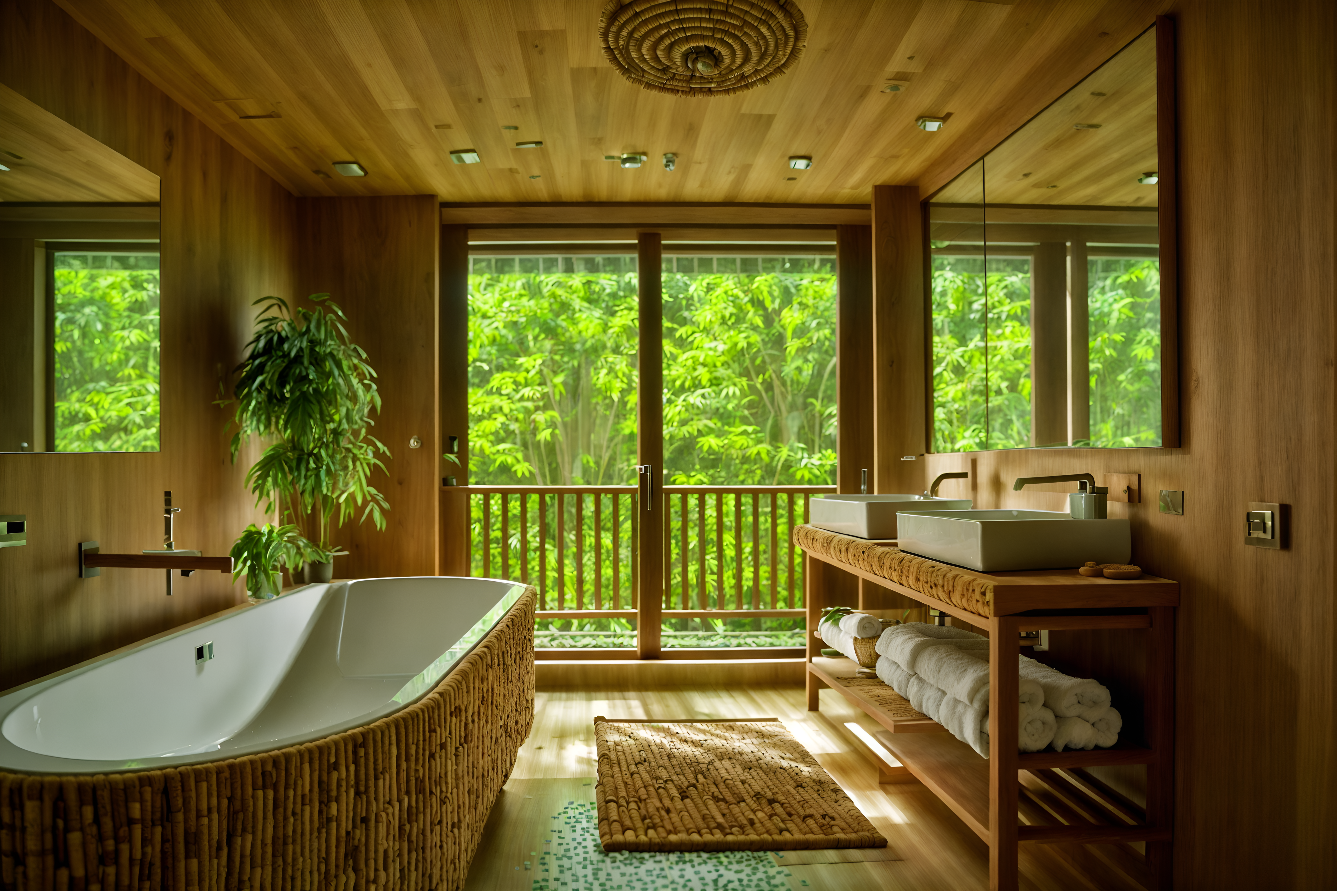 photo from pinterest of biophilic-style interior designed (hotel bathroom interior) with plant and waste basket and bathtub and bathroom cabinet and mirror and bath rail and toilet seat and shower. . with natural elements and wood materials and cork materials and linen materials and sunlight and natural shapes and forms and images of animals and natural environment. . cinematic photo, highly detailed, cinematic lighting, ultra-detailed, ultrarealistic, photorealism, 8k. trending on pinterest. biophilic interior design style. masterpiece, cinematic light, ultrarealistic+, photorealistic+, 8k, raw photo, realistic, sharp focus on eyes, (symmetrical eyes), (intact eyes), hyperrealistic, highest quality, best quality, , highly detailed, masterpiece, best quality, extremely detailed 8k wallpaper, masterpiece, best quality, ultra-detailed, best shadow, detailed background, detailed face, detailed eyes, high contrast, best illumination, detailed face, dulux, caustic, dynamic angle, detailed glow. dramatic lighting. highly detailed, insanely detailed hair, symmetrical, intricate details, professionally retouched, 8k high definition. strong bokeh. award winning photo.