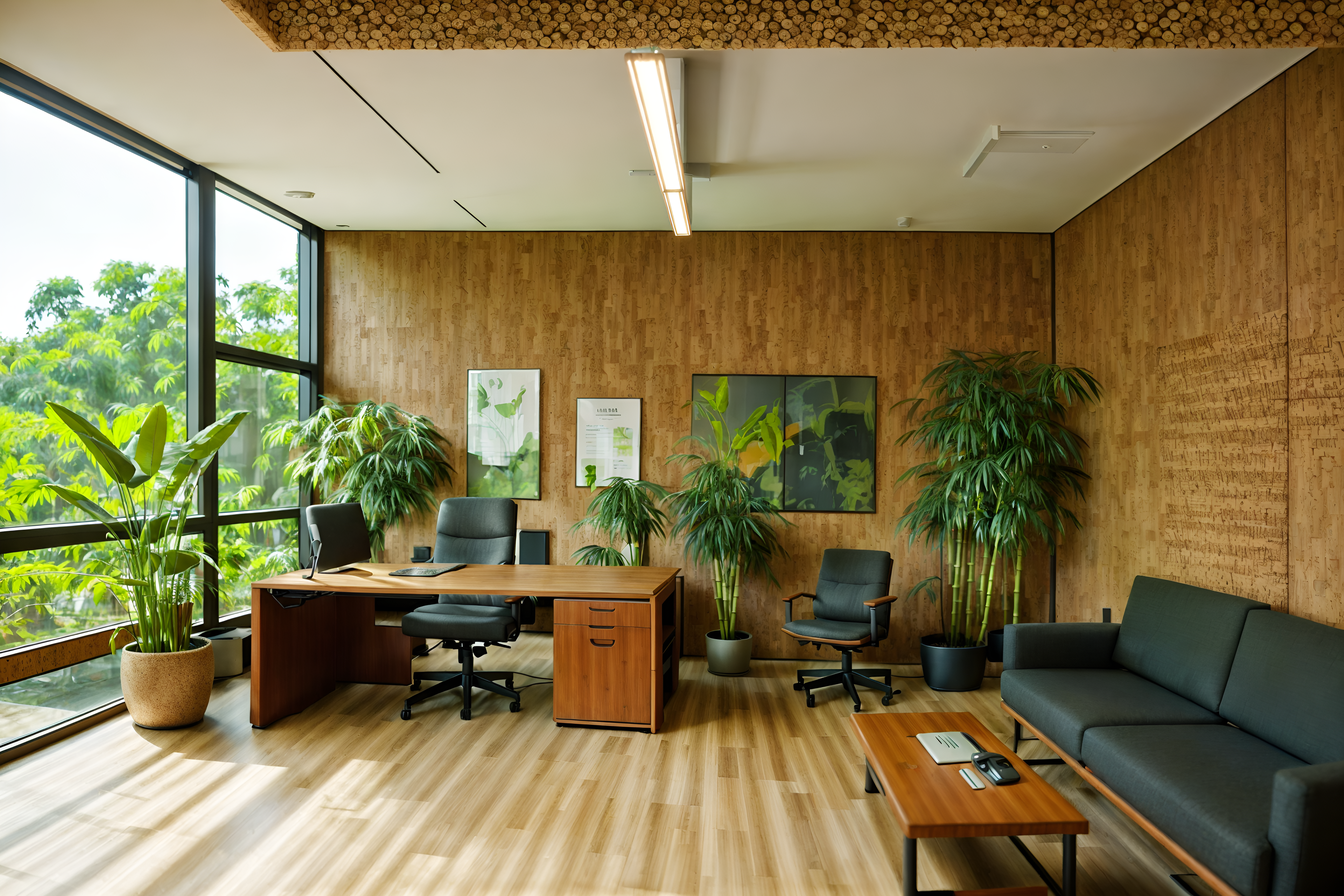 photo from pinterest of biophilic-style interior designed (office interior) with seating area with sofa and office desks and lounge chairs and computer desks and cabinets and plants and desk lamps and windows. . with natural environment and calming style and cork materials and earthy colors and sunlight and natural elements and natural shapes and forms and bamboo materials. . cinematic photo, highly detailed, cinematic lighting, ultra-detailed, ultrarealistic, photorealism, 8k. trending on pinterest. biophilic interior design style. masterpiece, cinematic light, ultrarealistic+, photorealistic+, 8k, raw photo, realistic, sharp focus on eyes, (symmetrical eyes), (intact eyes), hyperrealistic, highest quality, best quality, , highly detailed, masterpiece, best quality, extremely detailed 8k wallpaper, masterpiece, best quality, ultra-detailed, best shadow, detailed background, detailed face, detailed eyes, high contrast, best illumination, detailed face, dulux, caustic, dynamic angle, detailed glow. dramatic lighting. highly detailed, insanely detailed hair, symmetrical, intricate details, professionally retouched, 8k high definition. strong bokeh. award winning photo.
