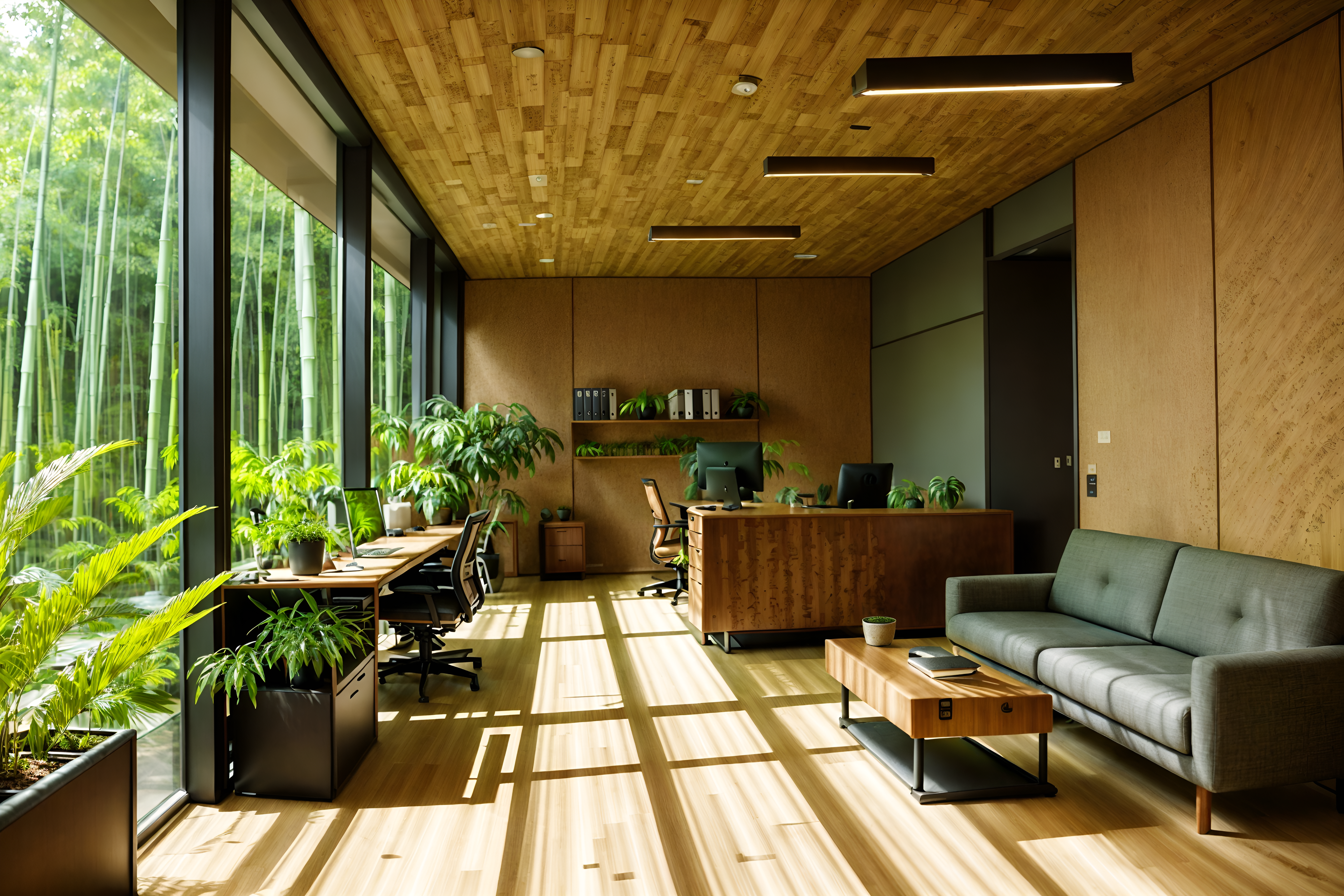 photo from pinterest of biophilic-style interior designed (office interior) with seating area with sofa and office desks and lounge chairs and computer desks and cabinets and plants and desk lamps and windows. . with natural environment and calming style and cork materials and earthy colors and sunlight and natural elements and natural shapes and forms and bamboo materials. . cinematic photo, highly detailed, cinematic lighting, ultra-detailed, ultrarealistic, photorealism, 8k. trending on pinterest. biophilic interior design style. masterpiece, cinematic light, ultrarealistic+, photorealistic+, 8k, raw photo, realistic, sharp focus on eyes, (symmetrical eyes), (intact eyes), hyperrealistic, highest quality, best quality, , highly detailed, masterpiece, best quality, extremely detailed 8k wallpaper, masterpiece, best quality, ultra-detailed, best shadow, detailed background, detailed face, detailed eyes, high contrast, best illumination, detailed face, dulux, caustic, dynamic angle, detailed glow. dramatic lighting. highly detailed, insanely detailed hair, symmetrical, intricate details, professionally retouched, 8k high definition. strong bokeh. award winning photo.