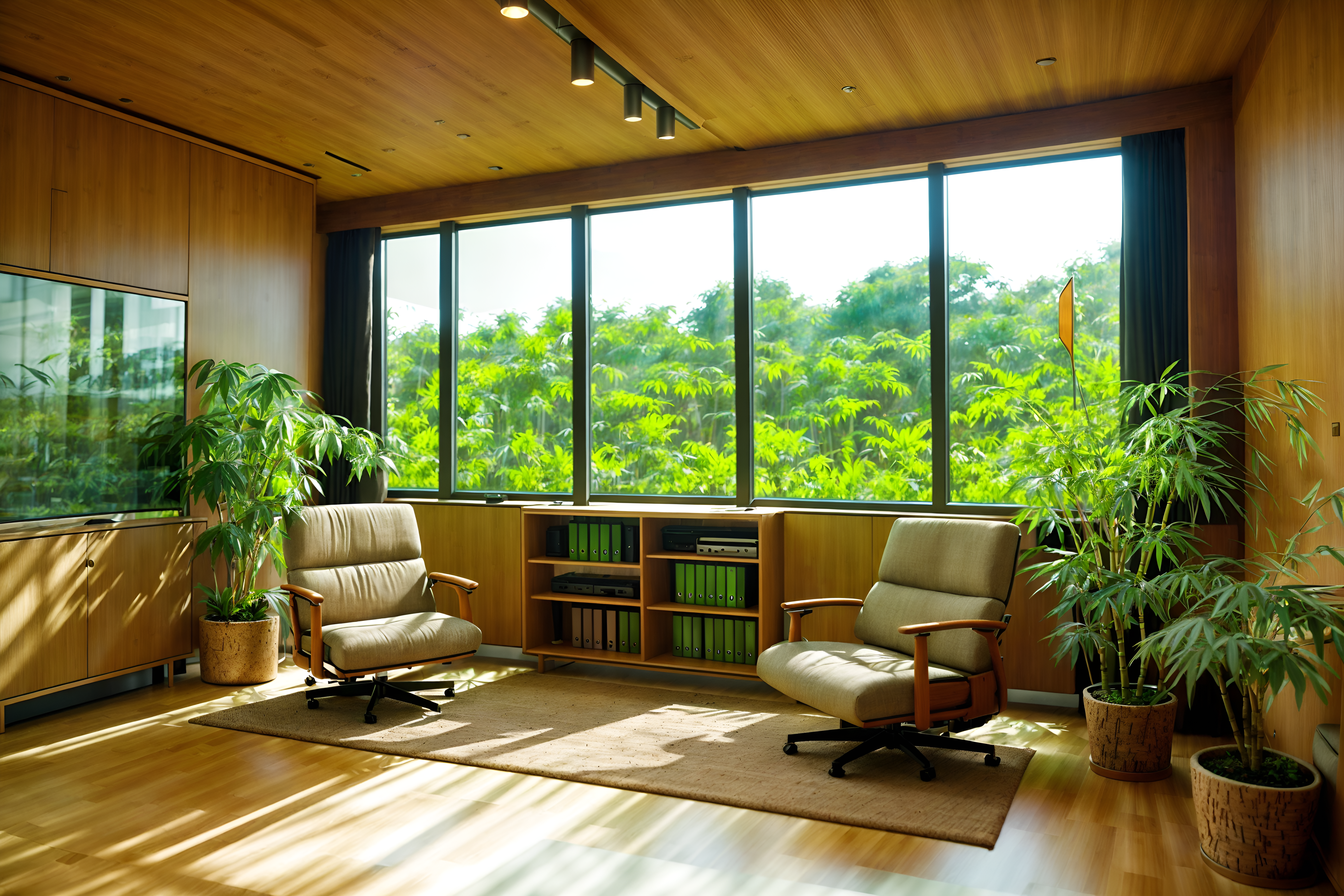 photo from pinterest of biophilic-style interior designed (office interior) with seating area with sofa and office desks and lounge chairs and computer desks and cabinets and plants and desk lamps and windows. . with natural environment and calming style and cork materials and earthy colors and sunlight and natural elements and natural shapes and forms and bamboo materials. . cinematic photo, highly detailed, cinematic lighting, ultra-detailed, ultrarealistic, photorealism, 8k. trending on pinterest. biophilic interior design style. masterpiece, cinematic light, ultrarealistic+, photorealistic+, 8k, raw photo, realistic, sharp focus on eyes, (symmetrical eyes), (intact eyes), hyperrealistic, highest quality, best quality, , highly detailed, masterpiece, best quality, extremely detailed 8k wallpaper, masterpiece, best quality, ultra-detailed, best shadow, detailed background, detailed face, detailed eyes, high contrast, best illumination, detailed face, dulux, caustic, dynamic angle, detailed glow. dramatic lighting. highly detailed, insanely detailed hair, symmetrical, intricate details, professionally retouched, 8k high definition. strong bokeh. award winning photo.