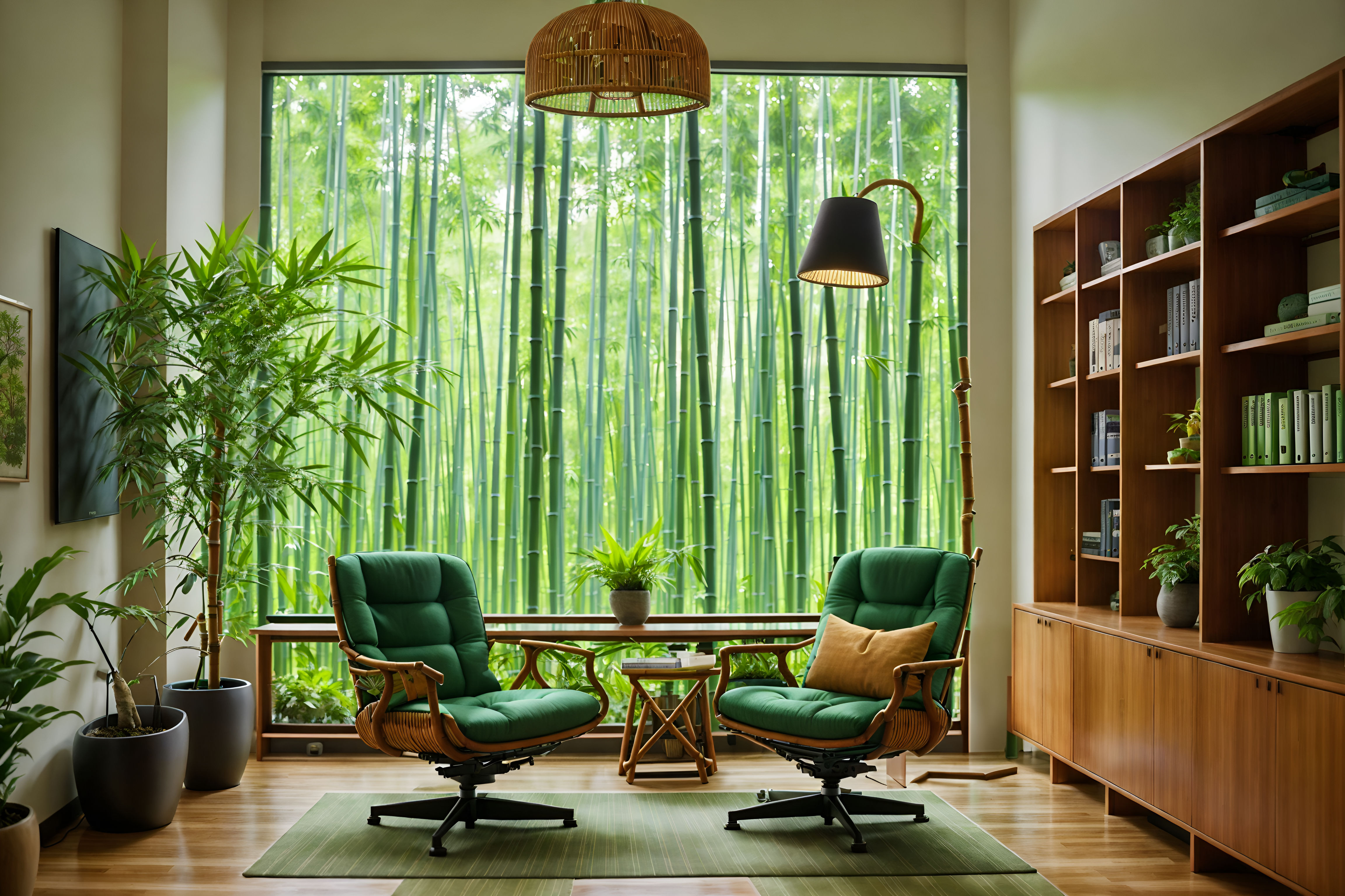 photo from pinterest of biophilic-style interior designed (study room interior) with lounge chair and plant and office chair and bookshelves and writing desk and desk lamp and cabinets and lounge chair. . with images of nature and features of nature and fresh air and bamboo materials and ceramic materials and natural shapes and forms and earthy colors and natural environment. . cinematic photo, highly detailed, cinematic lighting, ultra-detailed, ultrarealistic, photorealism, 8k. trending on pinterest. biophilic interior design style. masterpiece, cinematic light, ultrarealistic+, photorealistic+, 8k, raw photo, realistic, sharp focus on eyes, (symmetrical eyes), (intact eyes), hyperrealistic, highest quality, best quality, , highly detailed, masterpiece, best quality, extremely detailed 8k wallpaper, masterpiece, best quality, ultra-detailed, best shadow, detailed background, detailed face, detailed eyes, high contrast, best illumination, detailed face, dulux, caustic, dynamic angle, detailed glow. dramatic lighting. highly detailed, insanely detailed hair, symmetrical, intricate details, professionally retouched, 8k high definition. strong bokeh. award winning photo.