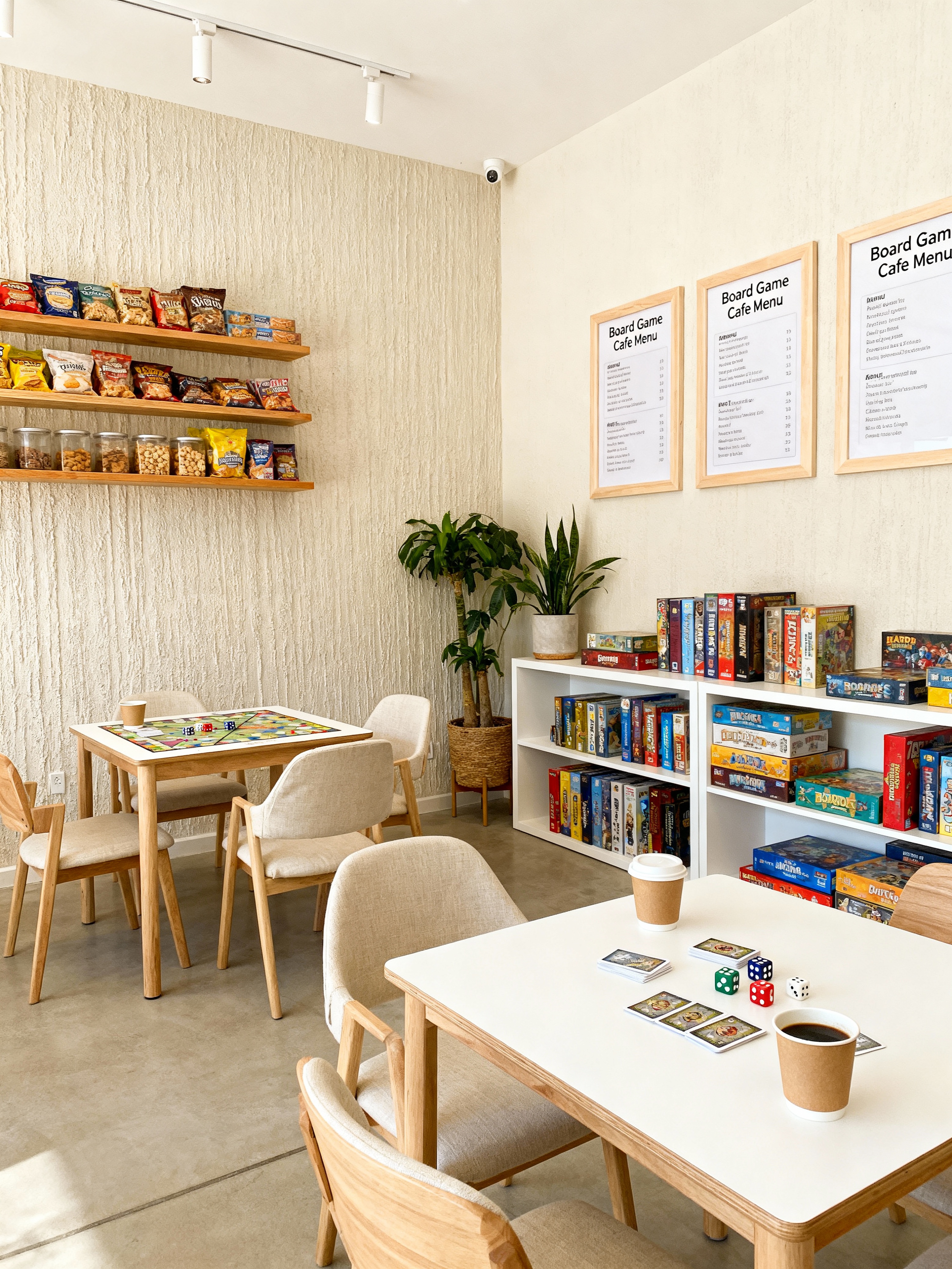 board game cafe with airbnb style with snacks and playing cards and dice and board games and game shelves and menu boards and game tables and coffee cups. . with scandinavian style and open and natural lighting and neutral walls and textures and simple, clean lines and simplistic furniture and natural materials and elements and practicality and functionality and simple color palette and scandinavian style