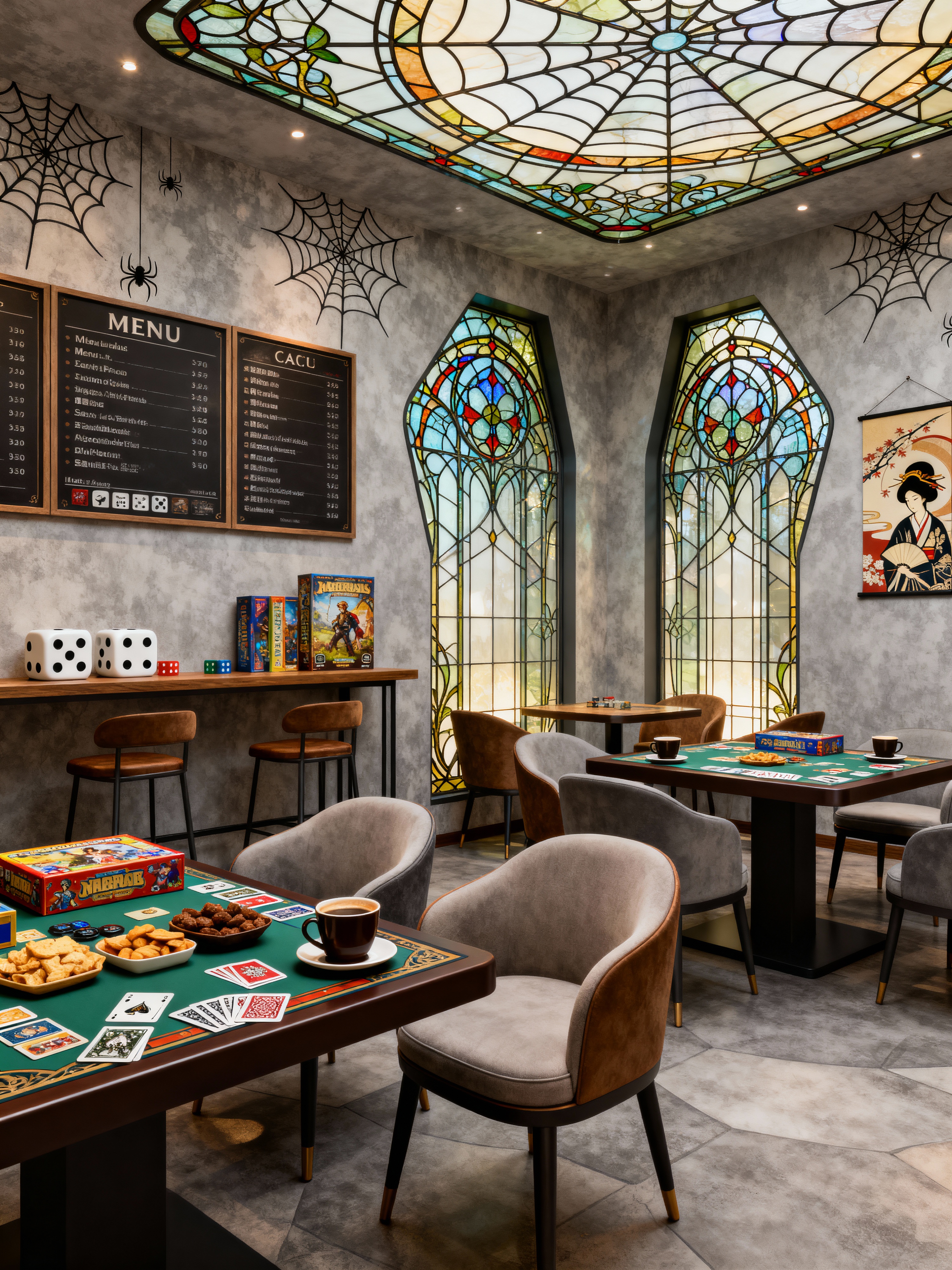 board game cafe with art nouveau style with menu boards and dice and game tables and board games and snacks and playing cards and comfortable chairs and coffee cups. . with wallpaper pattners of spider webs and stained glass and japanese motifs and asymmetrical shapes and stained glass and curved glass and soft, rounded lines and ashy colors